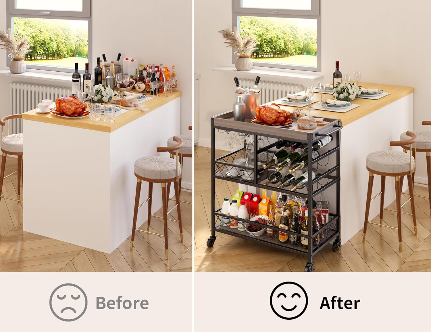 - 3. Versatile Storage Options: Ideal for storing wine and glassware, this cart also works as a dining cart for meals, a snack station in the living room, or a wine serving cart for outdoor gatherings, maximizing your space in style