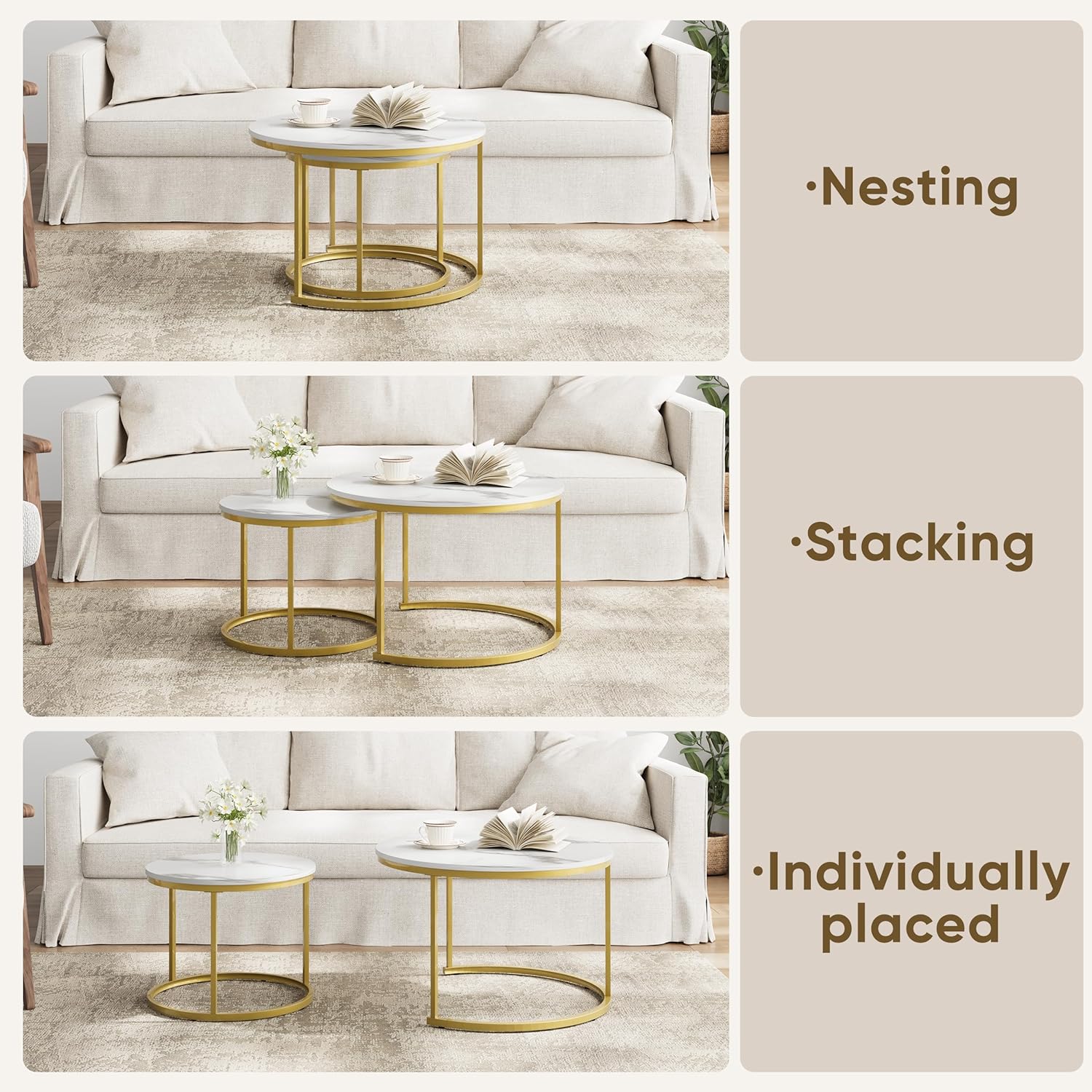 - 【Beautiful and practical】This round nesting table for the living room features a modern design style with elegant curves and simple lines. The gold metal base and marble grain pattern table top blend seamlessly with modern and industrial design while maintaining a rustic and minimalist aesthetic.