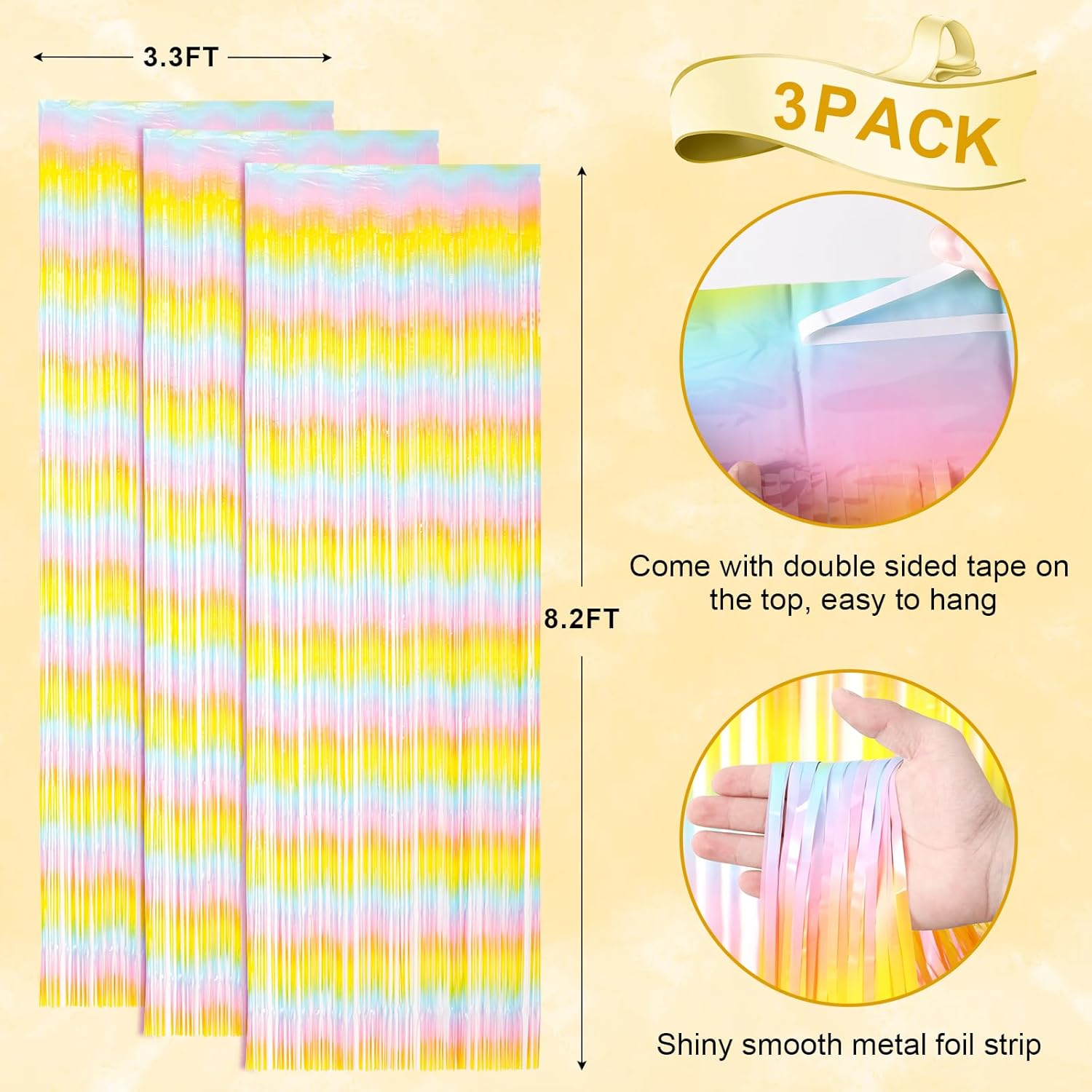 3 Pack 3.3 x 8.2 ft Pastel Rainbow Foil Fringe Backdrop Curtains, Tinsel Streamers Birthday Party Decorations, Fringe Backdrop for Graduation, Baby Shower, Gender Reveal, Disco Party