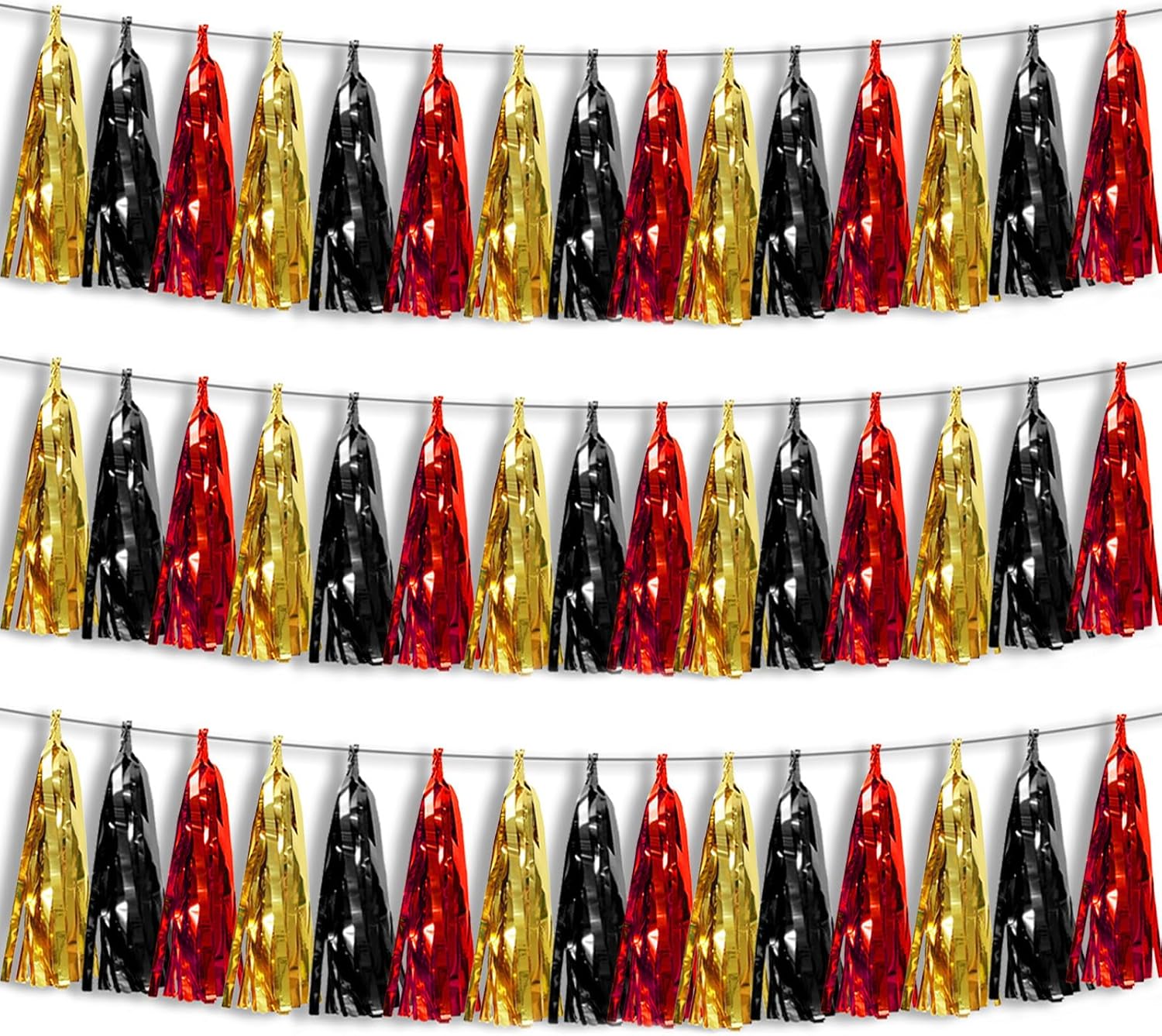 3P Black-Red Gold Foil Fringe Metallic Tassel Garland, Tassels Banner Streamers for Parade Floats, Bachelorette, Wedding, Birthday, Halloween, Christmas, Bridal/Baby Shower Party Decorations