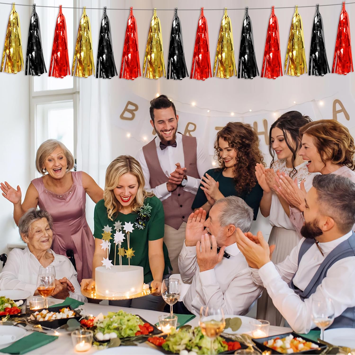 - 【Black Red Gold Party Supplies Set】: The total length of the black red gold birthday tassels banner is 29.5 feet 45tassels, divided into 3 strips, each 9.8 feet long. Each banner contains 15 tassels, and each tassel measures 14 inches, for birthday decorations many occasions, and so on