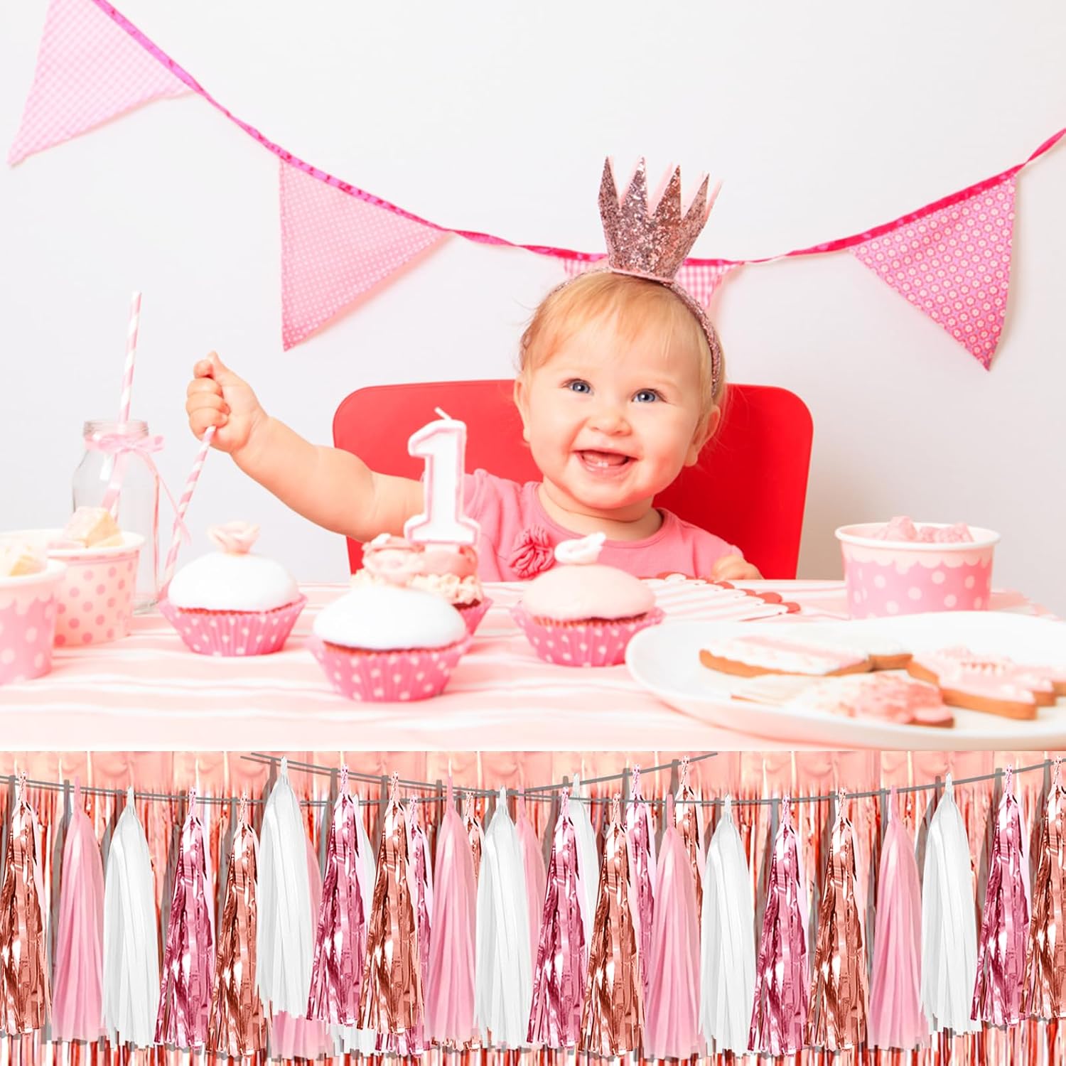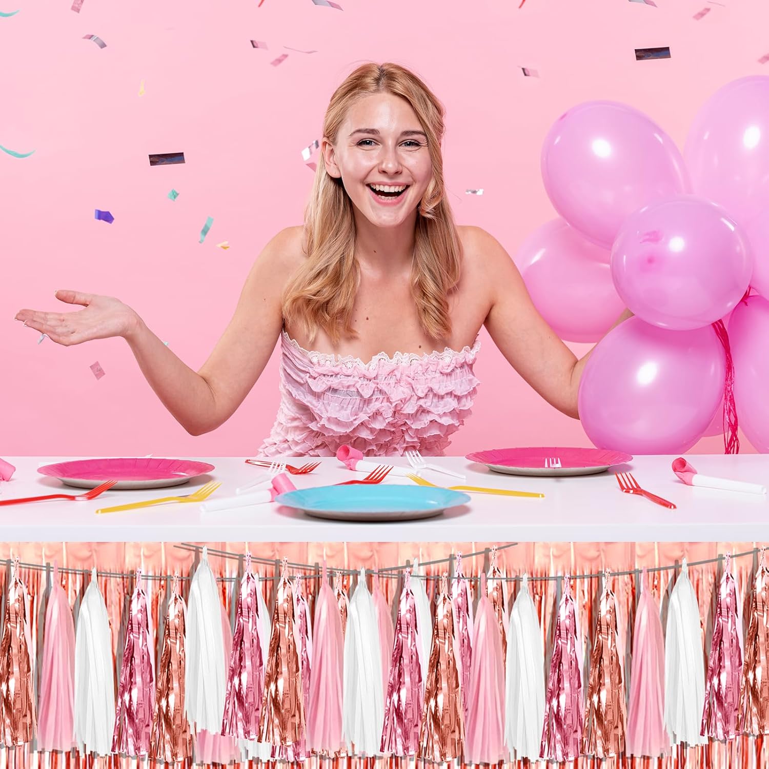 - 【Pink White Peach Rose Gold Party Supplies Set】: The total length of the pink white peach rose gold birthday tassels banner is 29.5 feet 45tassels, divided into 3 strips, each 9.8 feet long. Each banner contains 15 tassels, and each tassel measures 14 inches, for birthday decorations many occasions, and so on