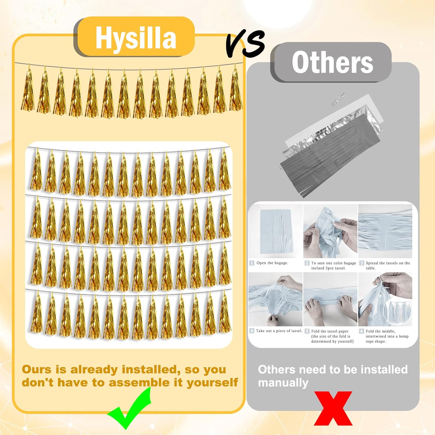 - 【Perfect Party Decoration】The gold tinsel garlands are designed in a metallic Fringe, bright, and beautiful, at the same time, they shine in the sun, and these gorgeous tassel garlands create a wonderful backdrop or centerpiece for your party space. and bring you, your family, and your friend's good Visual effects. your party many emotional and touching moments where a lot of pictures will be taken and everybody will have a wonderful time together.