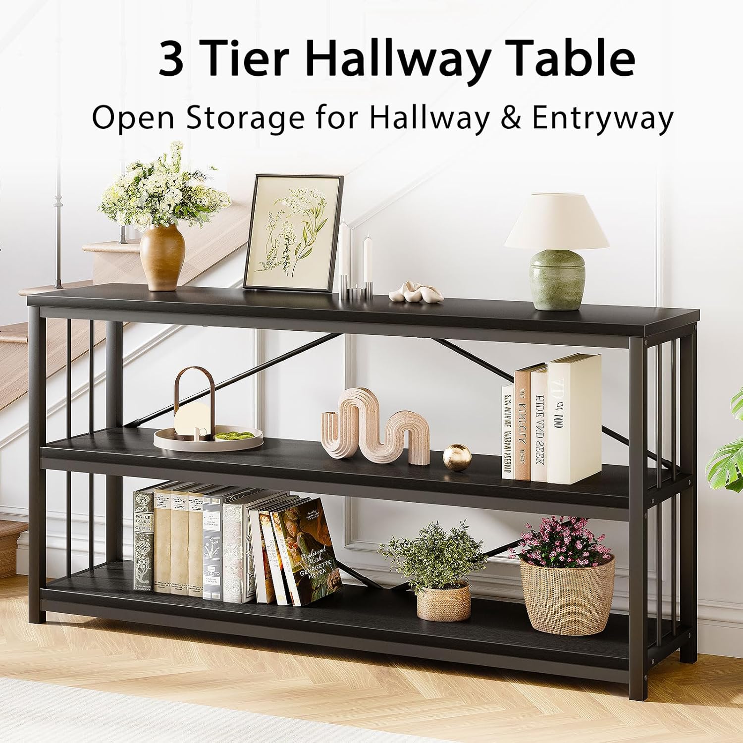 LVB Black Entryway Table, Modern Narrow Console for Hallway, Industrial Farmhouse Foyer Table with Storage Shelves, 63 Inch