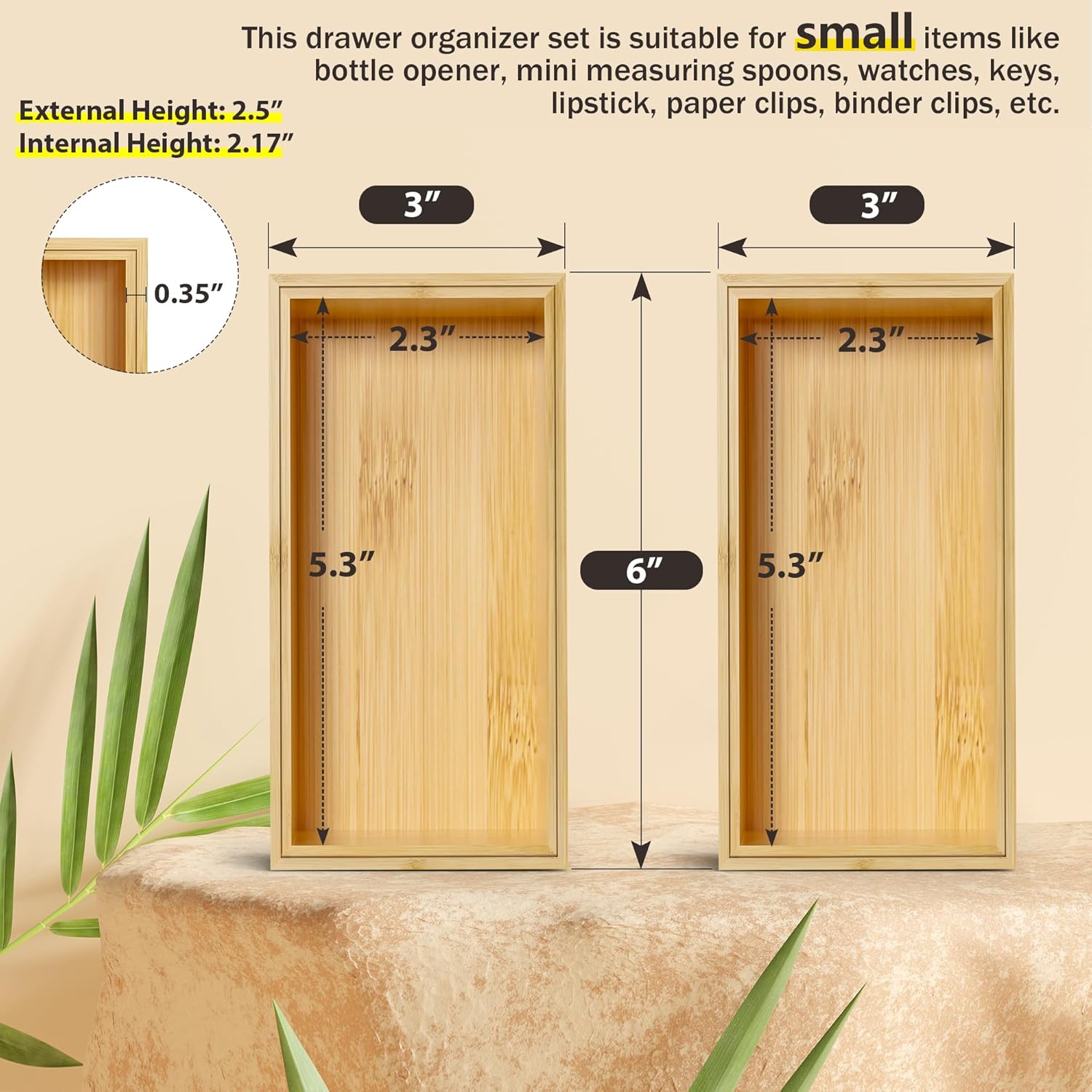 Kitchen Drawer Organizer Bins, Stackable Bamboo Deep Drawer Organizer for Silverware, Utensils, Cutlery, Flatware, Junk Drawer, Dresser, Bathroom, 6" x 3" x 2.5" (Set of 2)