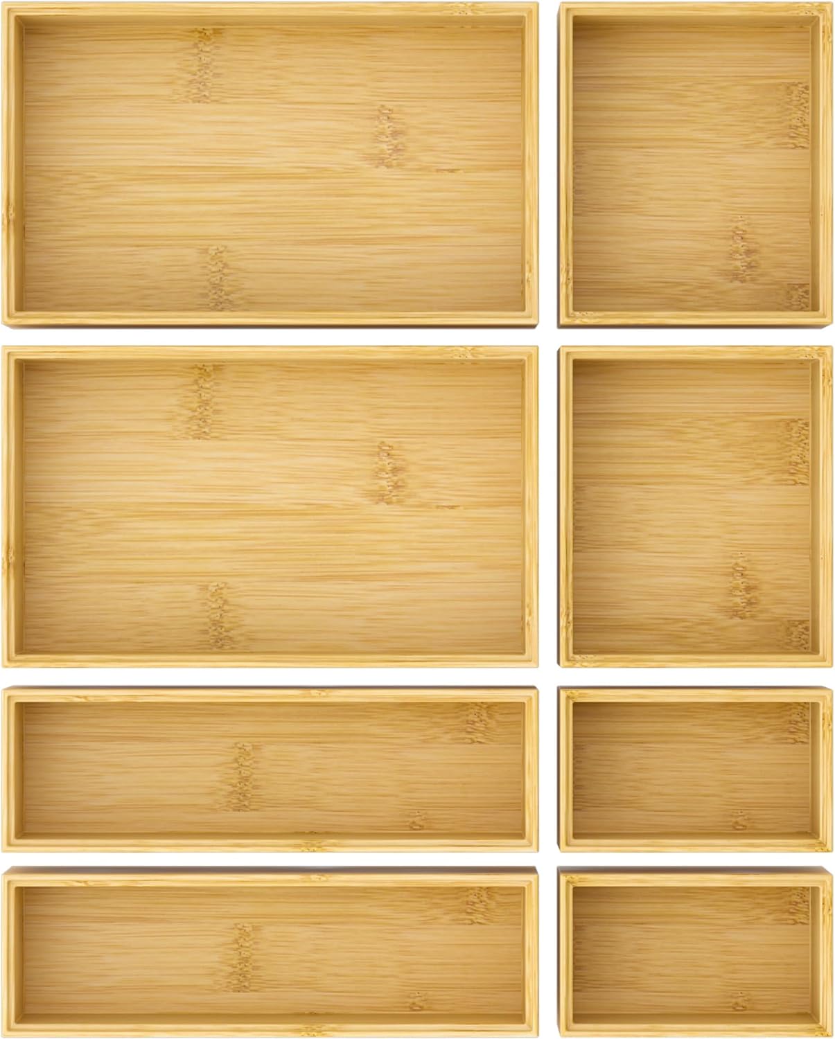 Bathroom Drawer Organizer Trays, Bamboo Silverware Drawer Organizer Kitchen Utensils, 8 PCS Wood Box Stackable Bins for Makeup, Office Desk, Vanity, Junk Drawer