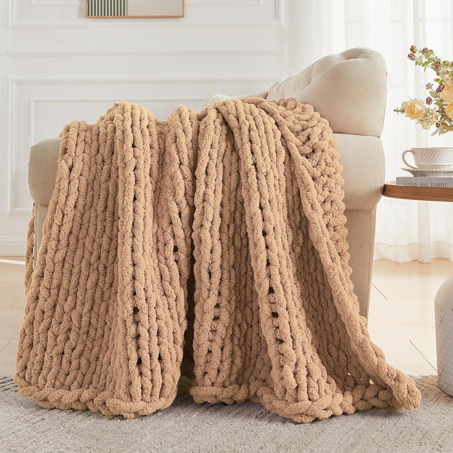 Carriediosa Chunky Knit Throw Blanket 60" X 80" Twin, 100% Hand Made Large Chenille Loop Yarn Soft Fluffy Throws for Couch Sofa Bed, Big Crochet Cozy Heavy Thick Cable Woven Blankets, Tan Brown