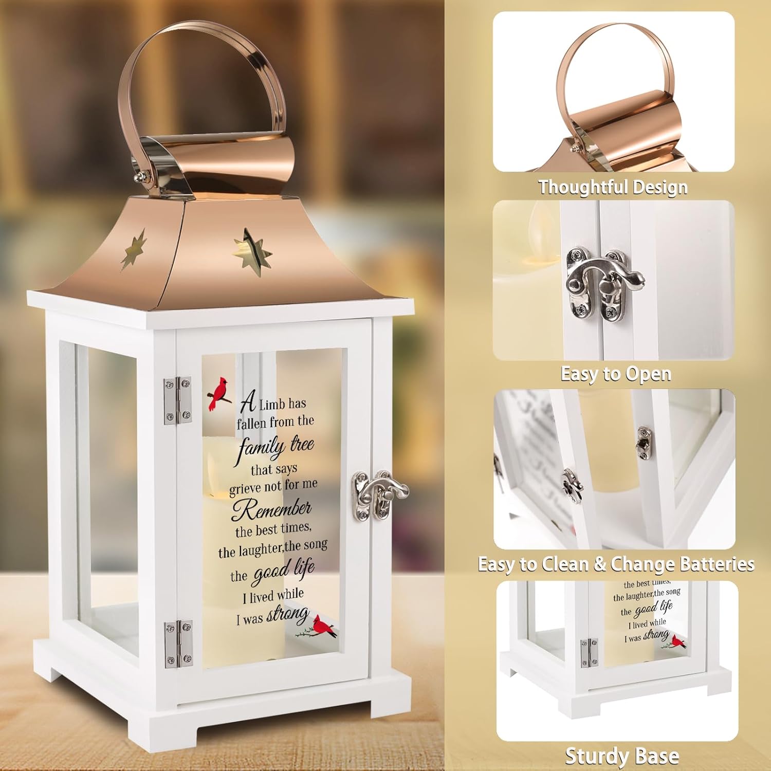 - Sympathy Lantern Gifts:This white stainless steel wood flameless bereavement lantern with flickering LED candle and sentimental verses is a great sympathy gift for loss of mother/father/loved one. For those who are struggling with grieving, it brings a lot of peace. The lantern's warm glow in the evening may comfort the receiver and give him/her a sense that the loved one is there watching over him/her. The cardinal on the gift box and the front glass gives us a feeling of someone we love being near.