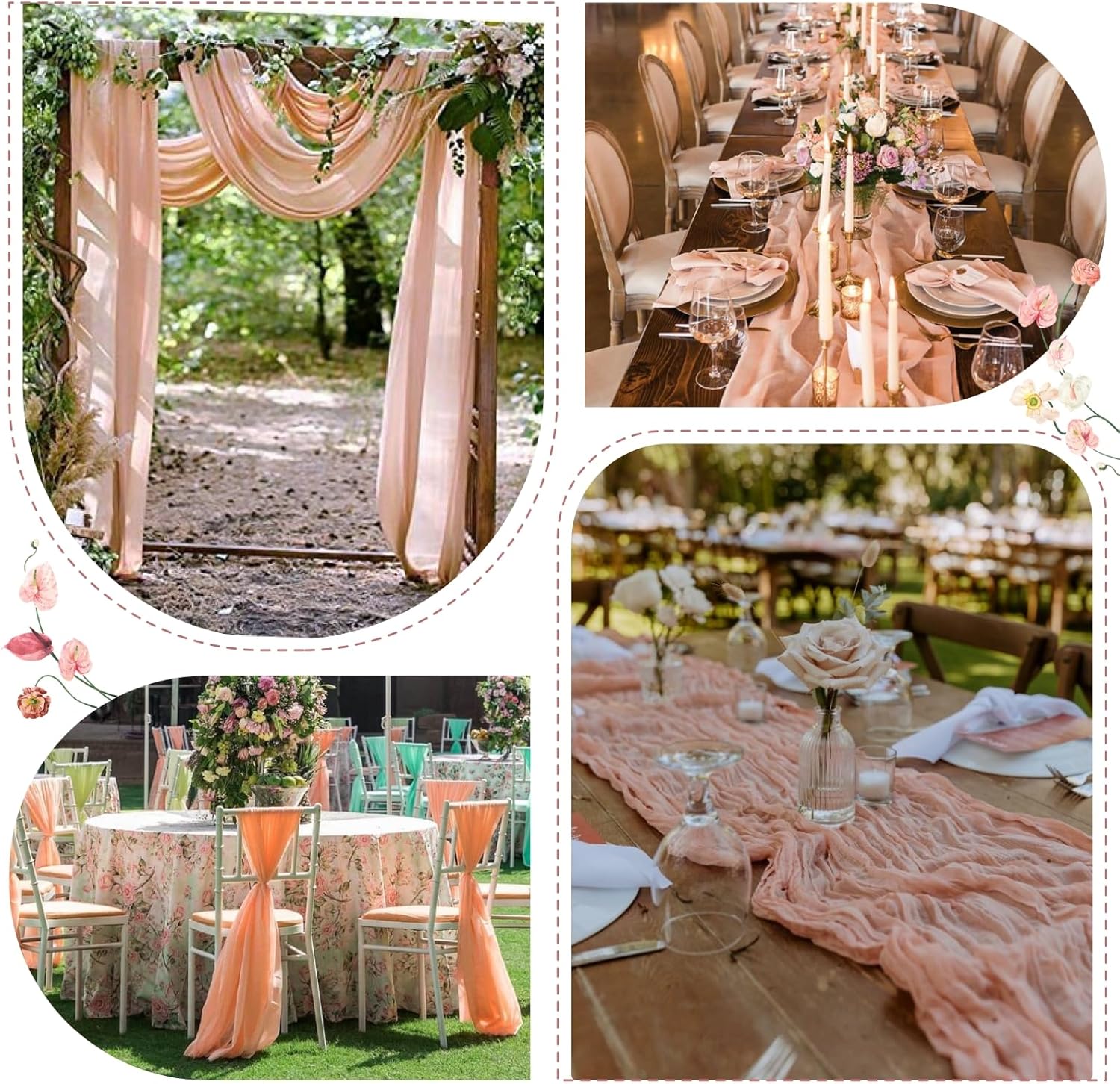 - 【Diversified Use】Boho cheesecloth Table Runner is necessary choice for beautifying tables. It's used for home decor, outdoor events, formal and informal setting in all seasons. Such as wedding decor, baby shower, bridal showers, parties, engagement banquet, Valentine's Day, Thanksgiving, Christmas.
