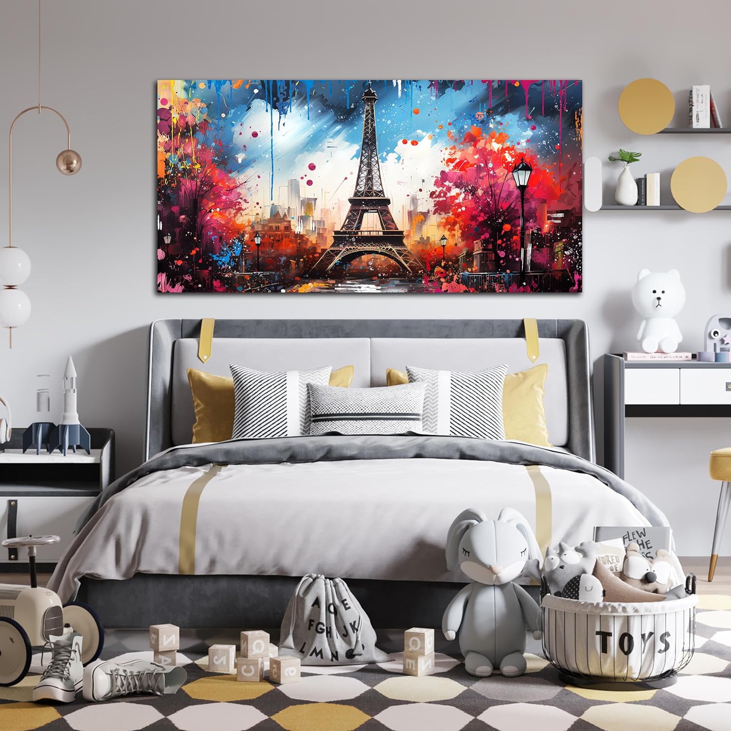 Large Canvas Wall Art Paris Eiffel Tower Decor Modern Blue and Red Graffiti Canvas Prints Ready to Hang for Living Room Bedroom Framed Home Decor Size 24x48