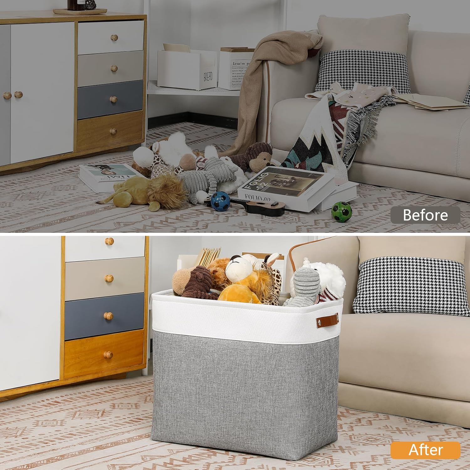 - 【Care】The fabric basket set comes with compression packing which may result in wrinkled and crumpled in long-distance transit. It can be smoothed out by steam iron.