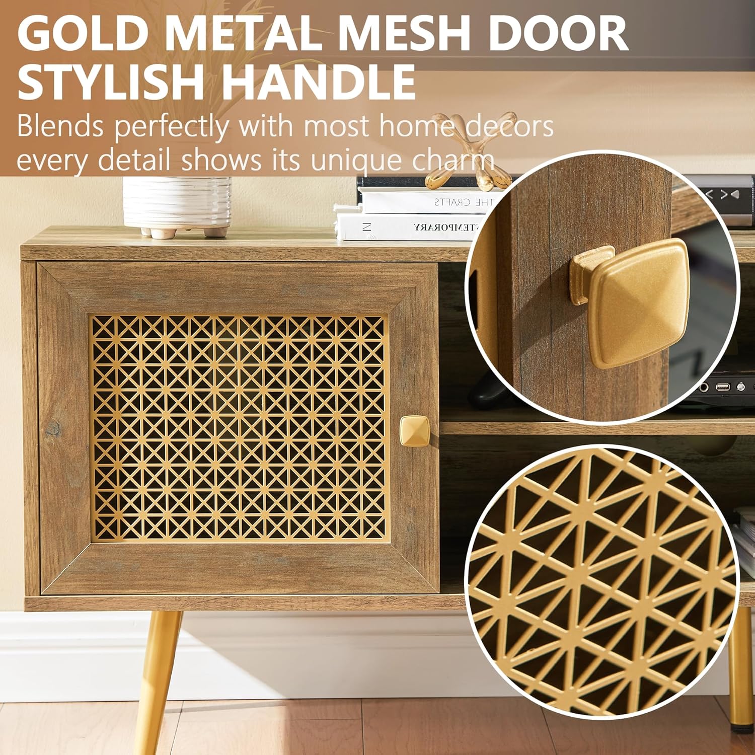 Mid Century Modern TV Stand with Metal Mesh Doors and Open Shelf for Tvs up to 65" Boho Media Console Entertainment Center with Cable Holes for Living Room Rustic Oak 59.06"x15.55"x20.87"