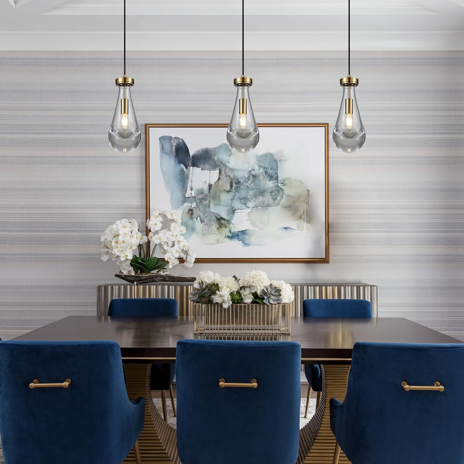 Raindrop Pendant Light Fixtures Set of 3, Brass Glass Pendant Lighting, Teardrops Modern Hanging Light for Entryway Foyer Kitchen Island Dining Living Room Hallway