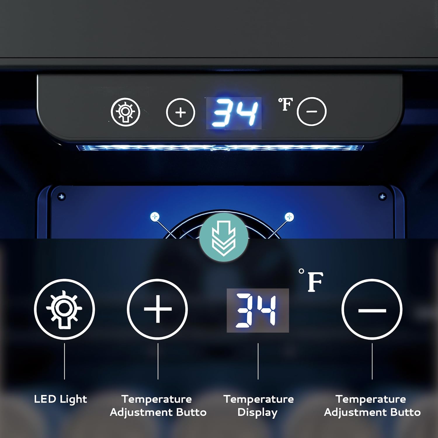 - One-touch operation & LED light - With an adjustable temperature range of 32-50°F (0-10°C), this beverage cooler offers easy one-touch settings at the touch of a button on the LCD display, providing perfect refrigeration at all times. The under counter refrigerator built-in soft blue ambient LED lights keep your beverages in a classy atmosphere and can help you select your favorite drinks in a dark setting