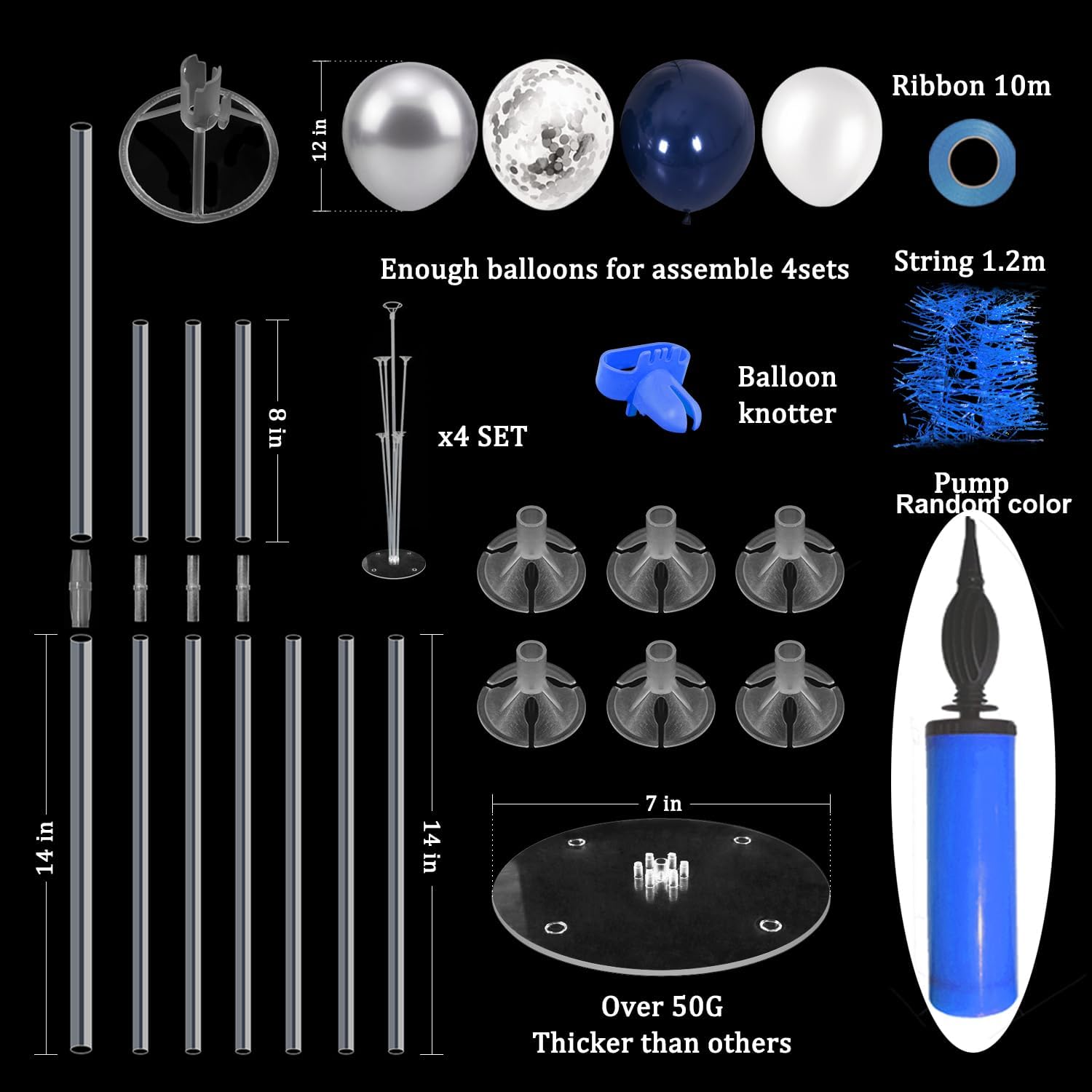 - WHAT INLCUDE: This balloon stand kit include 4 set balloon holders, 35pcs balloons - navy blue balloons, white balloons, silver and confetti balloons, balloon pump, balloon clips, ribbons, glue dots and tie tool
