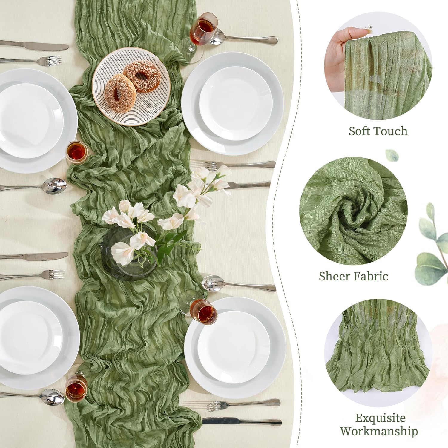 - PACKAGE INCLUDED: You will receive 24 pieces of sage green cheesecloth table runners. Elegant and beautiful design, exquisite workmanship. Product size: Each boho table runner is 35 x 120 inches. Enough to cover rectangles and round tables, as well as long tables that are stitched together. It can even be used to belt chairs decorate napkins, background curtains. Round or square tables for 8-10 people, perfect for romantic and elegant party events