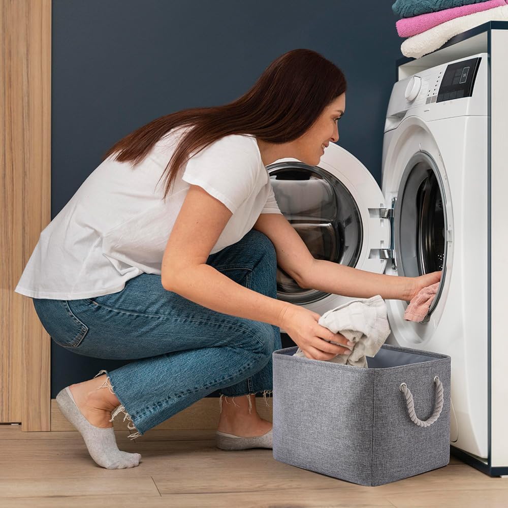 Storage Basket for Shelves - 17X15X12 inch 2 Pack Collapsible Storage Bin with Rope, Canvas Fabric Storage Cubes for Cloth Decorative Books Nursery (Grey)