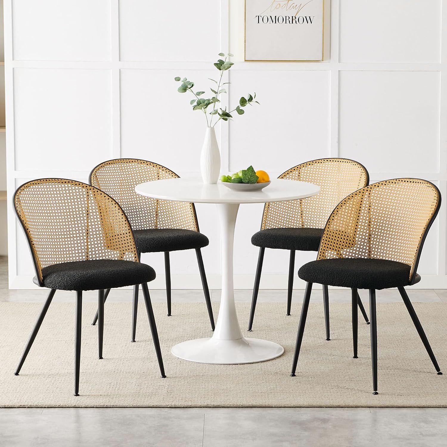 Dining Chairs Set of 4, Mid Century Modern Dining Room Chairs with Full Rattan Back, Boucle Fabric Upholstered Kitchen Dining Chairs Farmhouse Armless Mesh Cane Back Side Chairs with Metal Legs, Black