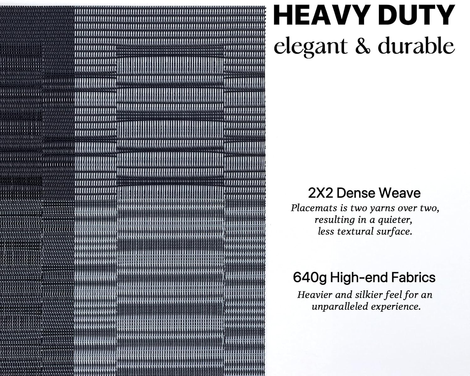 - HEAVY-DUTY:We uses the German-imported higher grammage vinyl material (Specialty PVC)than other placemats on the market,plus the precise,dense weave craftsmanship to give the woven placemats a thicker feel and make the place mats long-lasting.