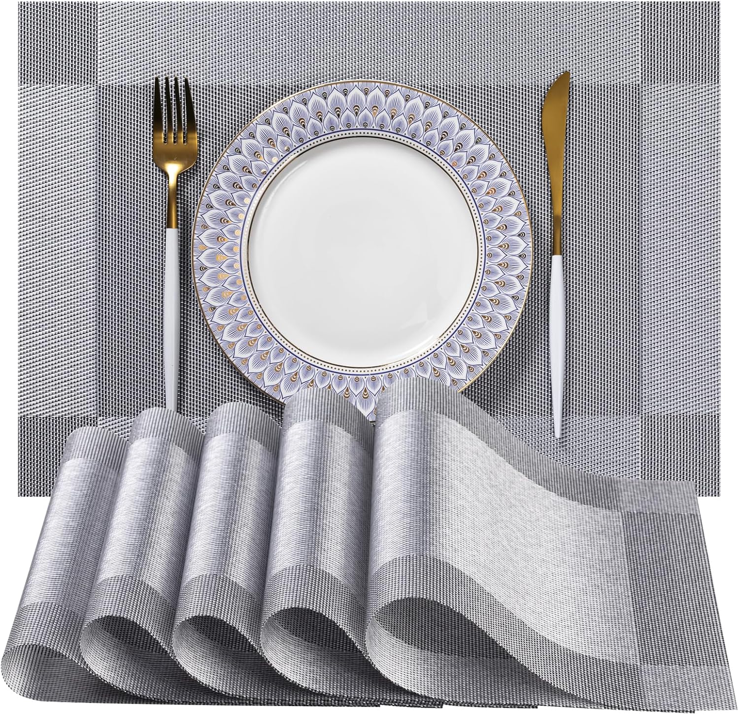 LEXMORE Placemats Set of 4 Vinyl/Plastic Woven Place Mats for Kitchen Table Indoor/Outdoor Washable Placemat Wipeable Dining Table Mats(Silver Cube)