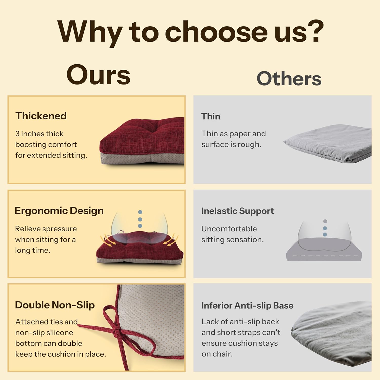 Non Slip Chair Cushions for Dining Chairs Set of 4 Kitchen Chair Cushions 18"x18"x3" Turfted Chair Pads Comfortable and Soft Seat Cushion with Ties, Burgundy