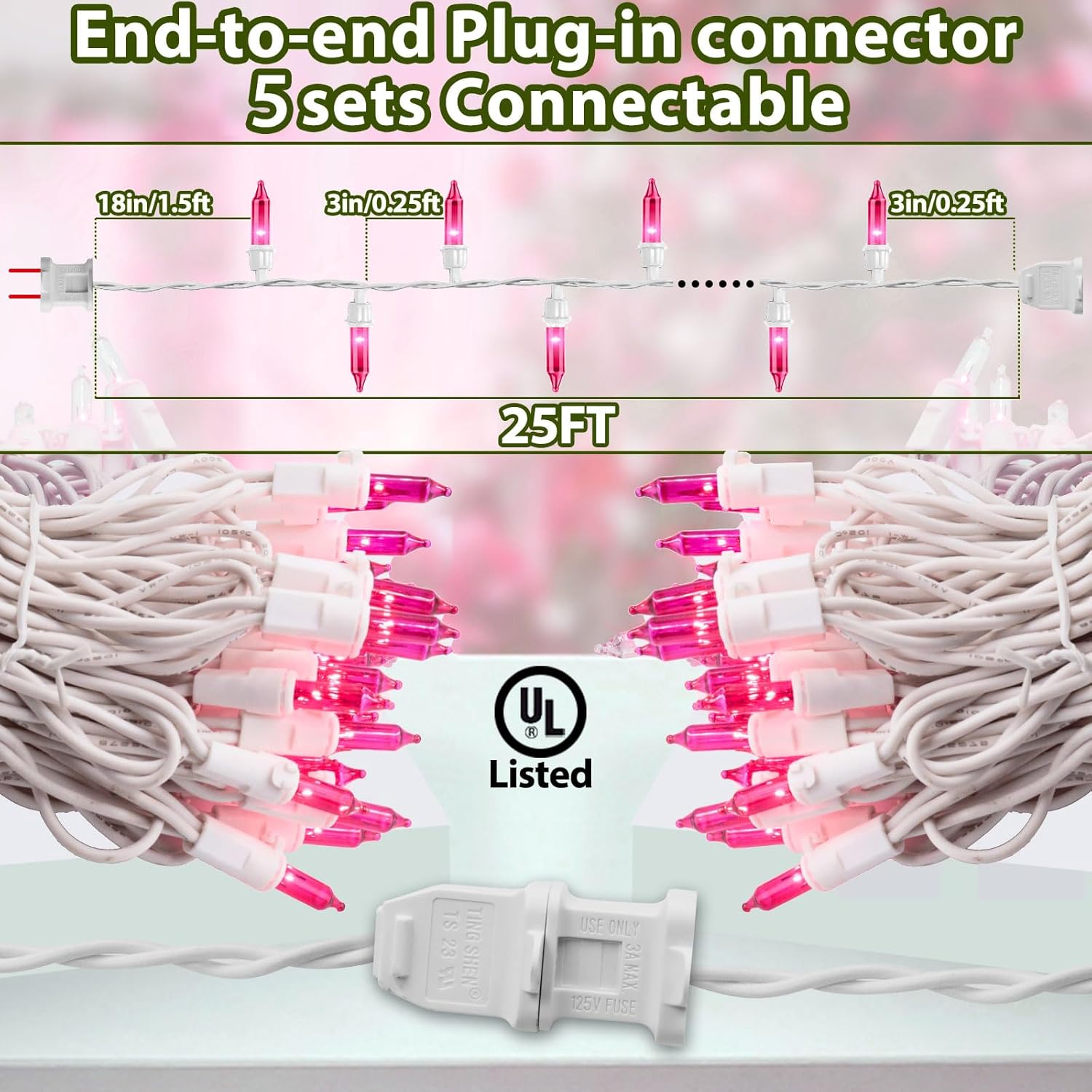 - End-to-End Connectable: 18" Lead Wire, 3" End Connector, 3’’ spacing between bulbs, 0.34 amperes. These pink mini string lights can be end-to-end connected, up to 5 sets(125FT 500Lights). You can better dress up your Valentine's Day or other holiday and let the lights expand the lighting range to increase the atmosphere for your holiday.