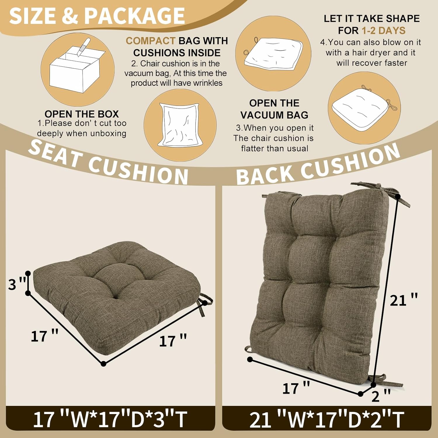 - ✦Size✦: Seat cushion is 17" x 17" x 3"; Back cushion is 21.6" x 17" x 2". Perfectly fit for the indoor rocking chair. The ties will keep the cushions stay in place.
