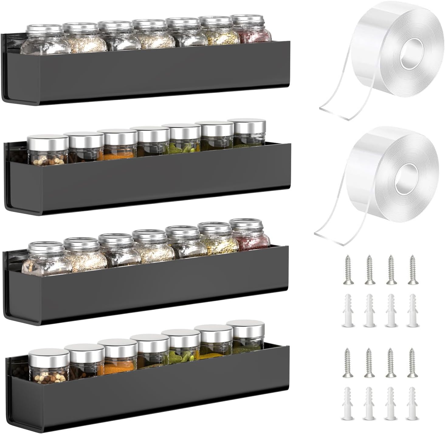 PMMASTO Adhesive Acrylic Spice Rack Organizer for Wall with Nano Double Sided Tape, Spice Shelf Organization for Kitchen Cabinet Door/Pantry Door, Wall Mount Seasoning Rack (Black - 4 Pack)