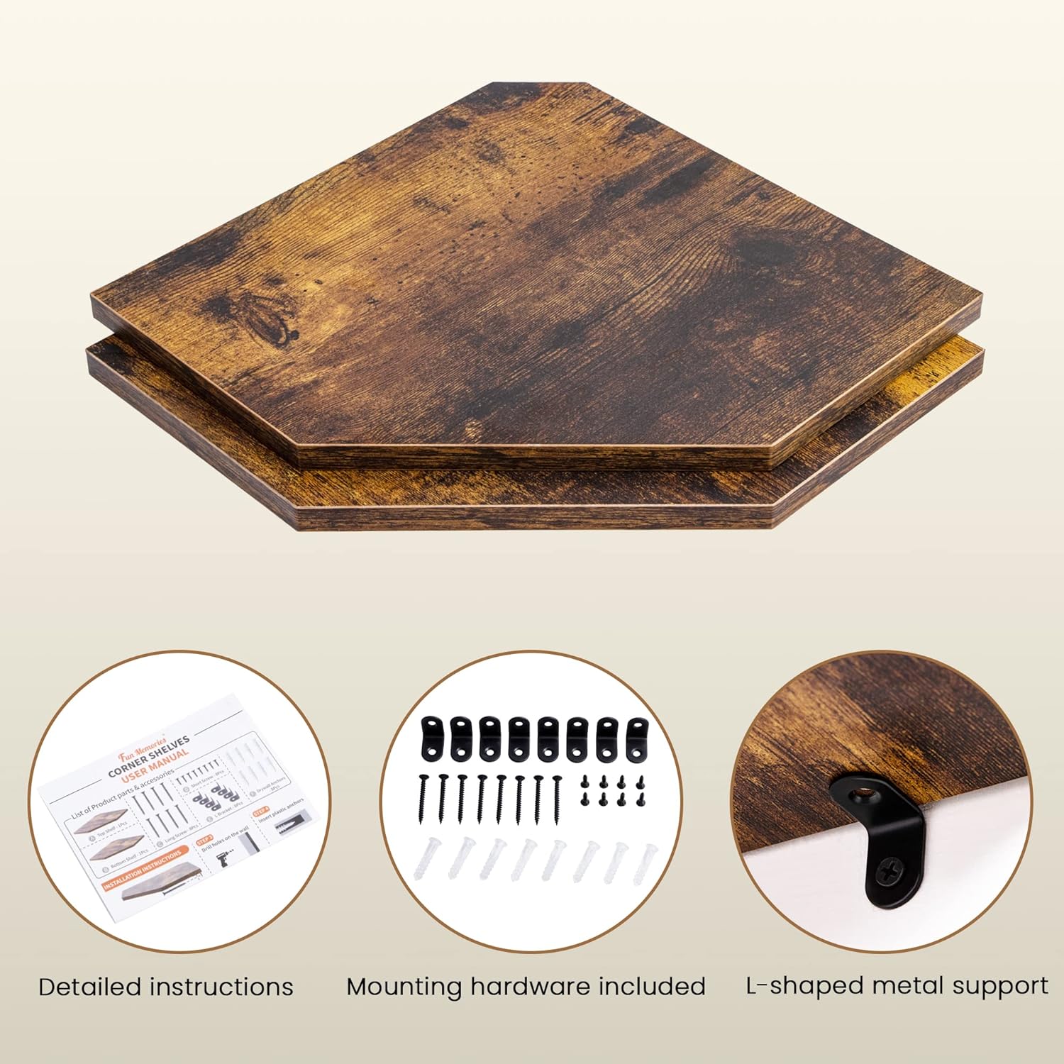 Corner Shelf Wall Mount, Floating Corner Shelves, Set of 4 Corner Wall Shelf Organizer, Rustic Wood Wall Storage Display Shelves for Living Room Bedroom Bathroom Kitchen, Rustic Brown