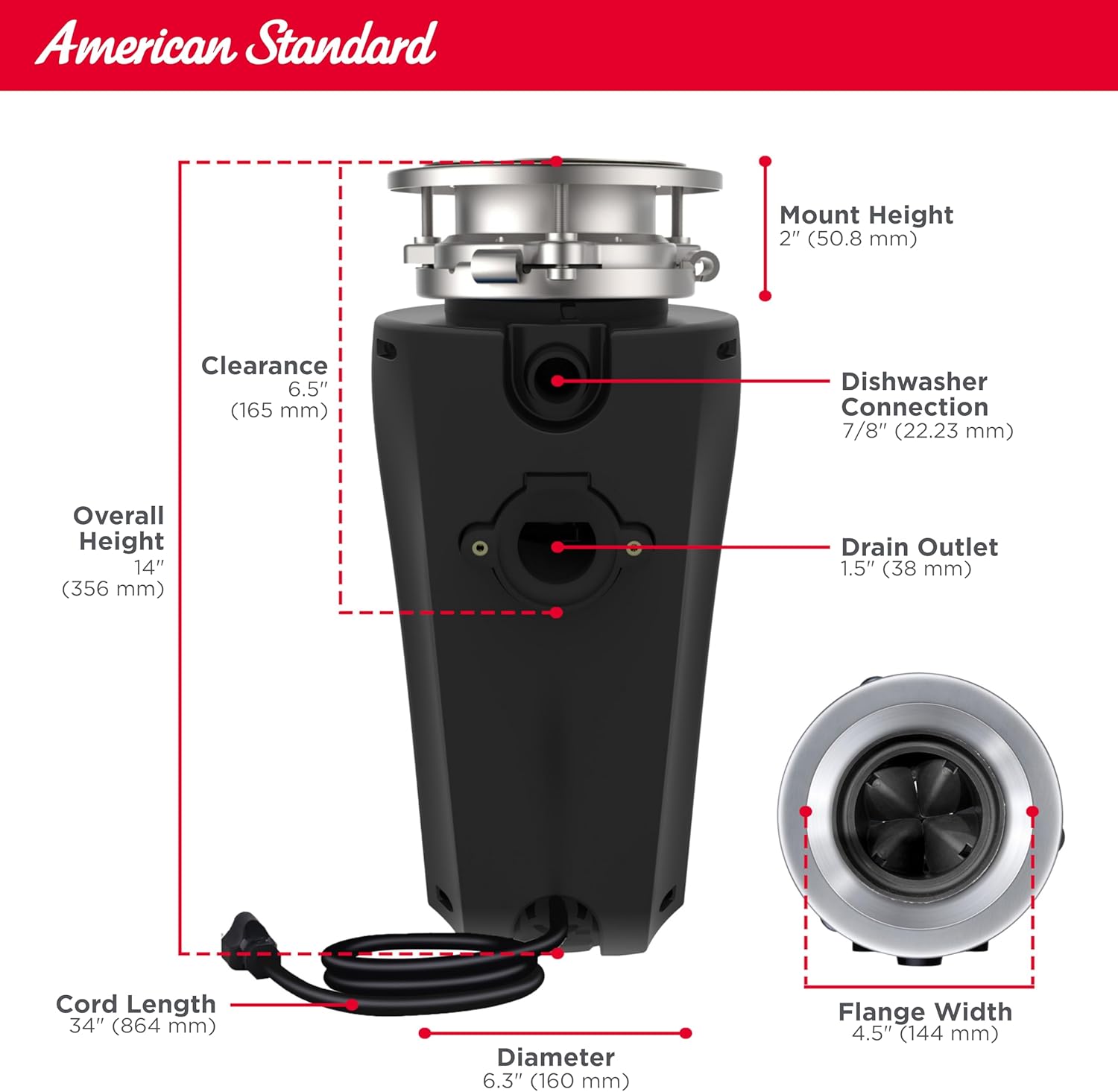- COMPACT DESIGN AND DURABLE CONSTRUCTION: With a compact and space-saving design, the American Standard Slim Line garbage disposal fits easily under the sink, maximizing available storage space in the kitchen; High-quality Stainless Steel materials ensure long-lasting performance for every-day use