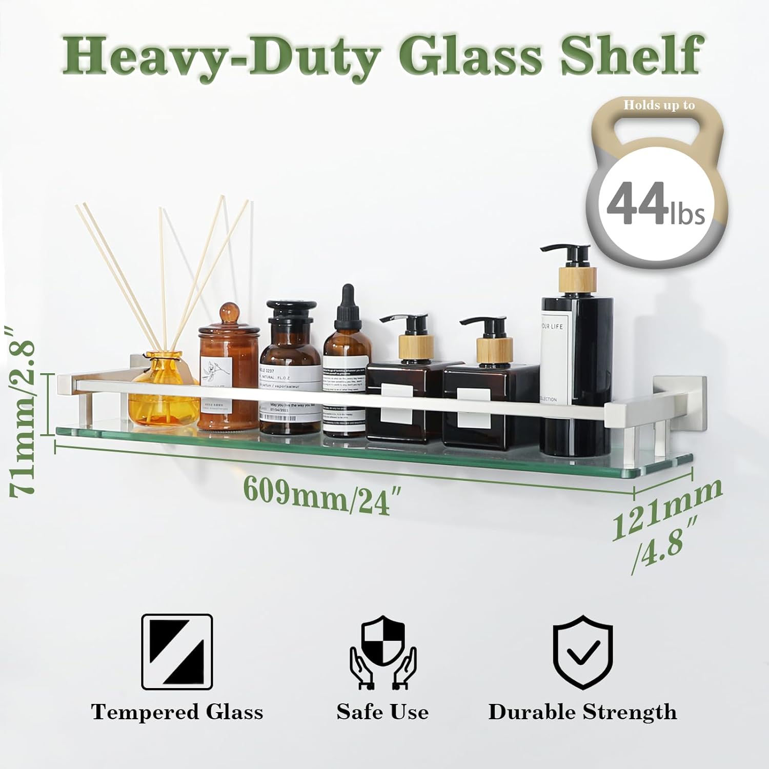 - TEMPERED GLASS:Our glass shelves are made with ultra-strong 8mm tempered glass and SUS304 stainless steel, ensuring a weight capacity that far exceeds standard shelves for reliable support