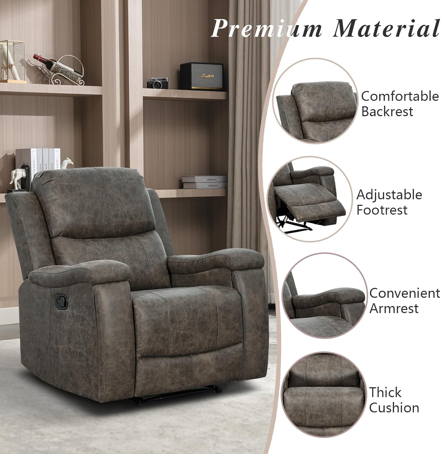 EBELLO Grey Recliner Chair, Single Overstuffed Sofa Recliners, Breathable Faux Leather Manual Reclining Chairs with Hidden Cup Holder, Arm and Back for Adults, Living Room, Bedroom, Grey