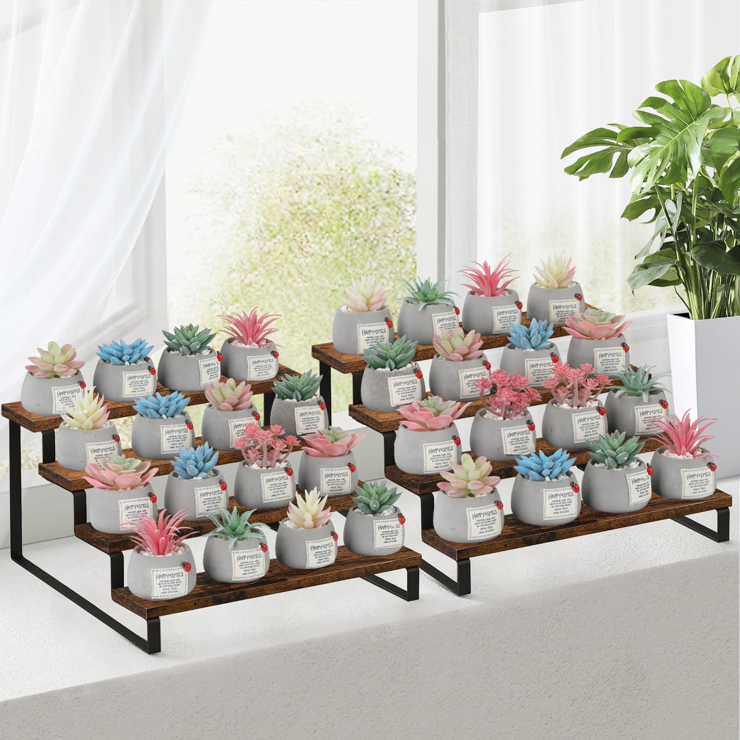 - Quick Setup & Easy Cleaning: You can have this 4-tier display riser stand assembled in 10 minutes with detailed instructions and tools. The wooden surface is waterproof and dust-free, a damp cloth could keep the counter shelf clean. (Assembly tools and accessories are included in the package)