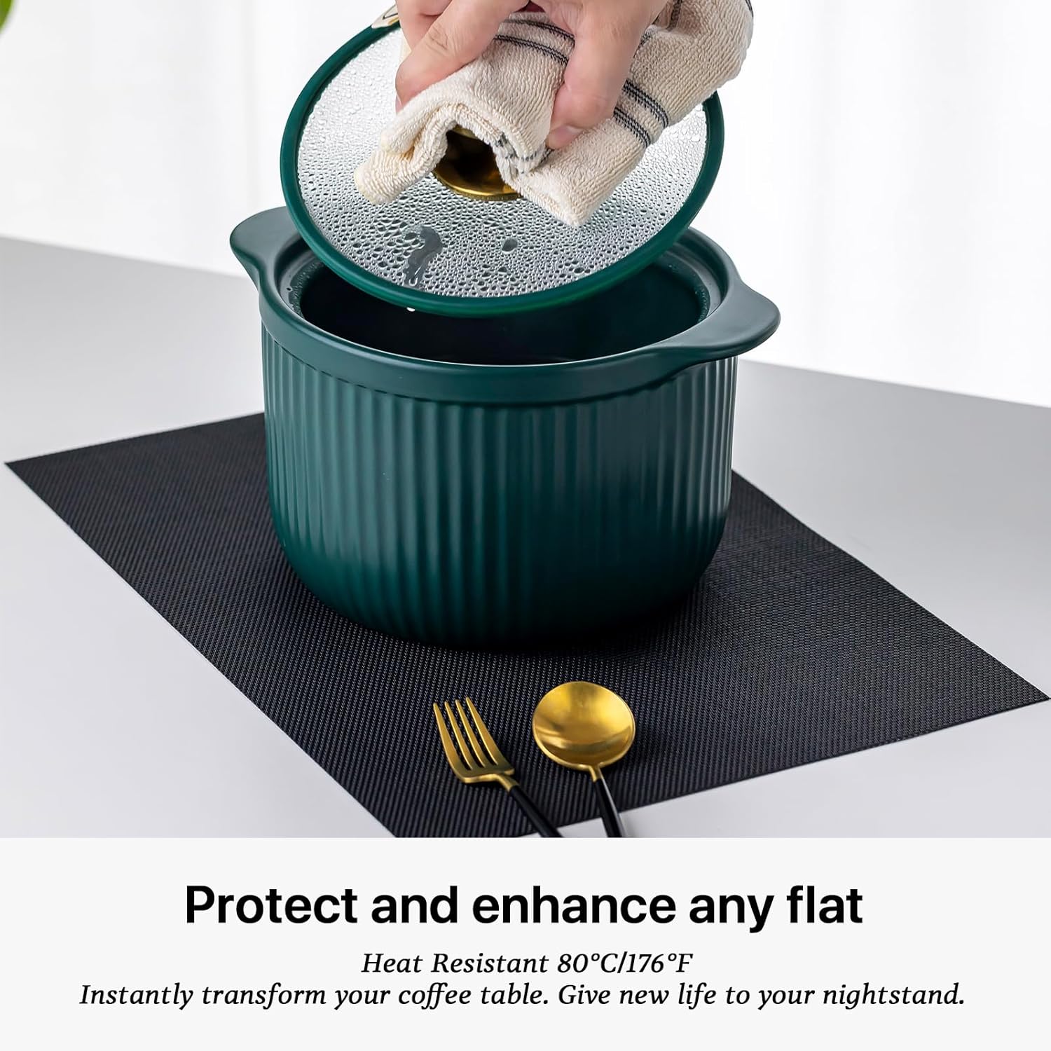 - HEAVY-DUTY:We uses the German-imported higher grammage vinyl material (Specialty PVC)than other placemats on the market,plus the precise,dense weave craftsmanship to give the woven placemats a thicker feel and make the place mats long-lasting.