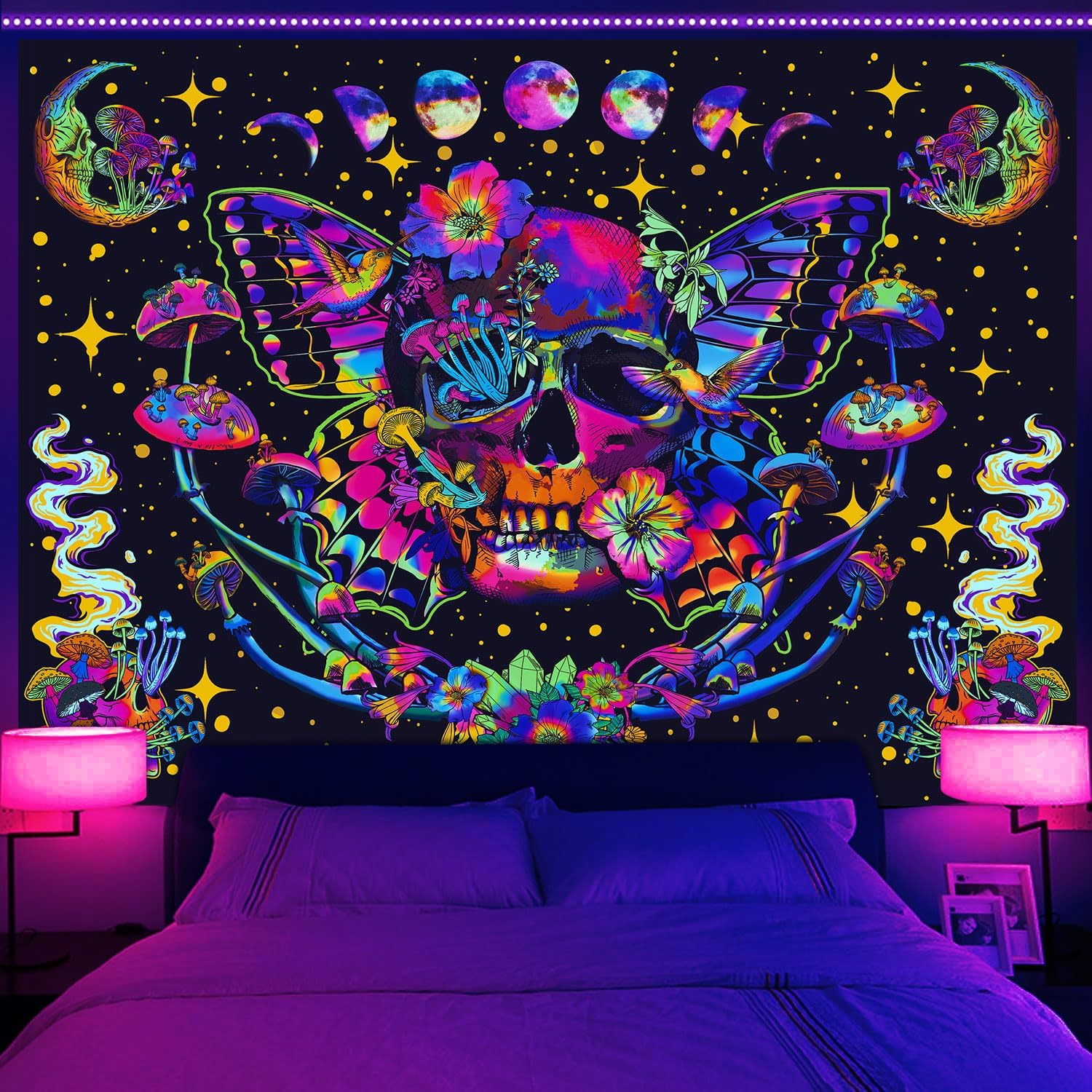 - Unique Pattern Design:The blacklight skull tapestry features a trippy skull, charming mushrooms, and mysterious butterfly. Under black/ultraviolet light, it can fill your room with mysterious and psychedelic colors.