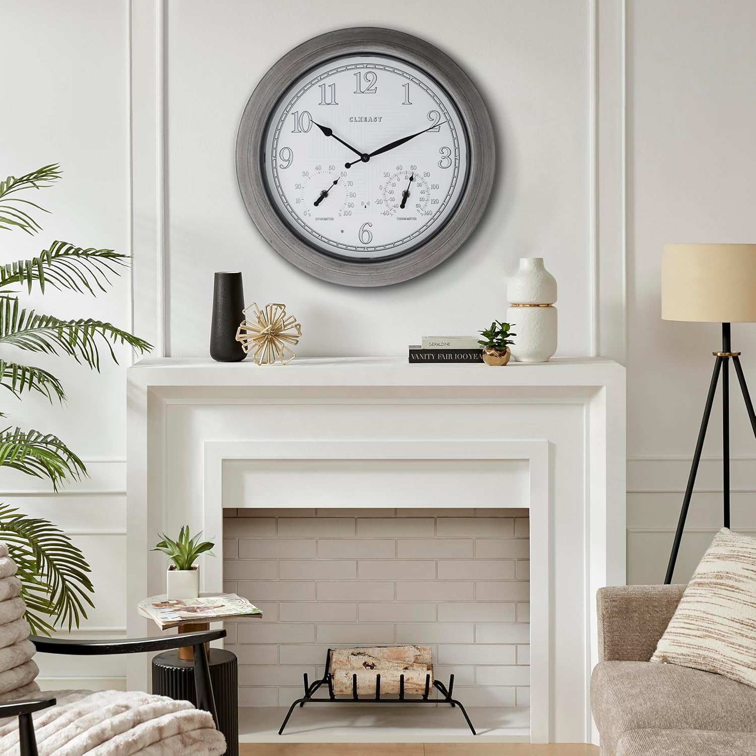 - 【IP65 Waterproof Outdoor/Indoor Atomic Wall Clock]-This hand brushed grey oak/faux barnwood 18 Inch large outdoor clock is UV resistant& weatherproof,sealed with front and back rubberized gasket for protection from water and other outdoor elements.An elegant timepiece for your outdoor garden,pool, patio or backyard,porch,modern farmhouse living room,dinning room,bathroom,kitchen,fireplace,entryway,home office; Make sure the clock is away from exposed direct elements like heat,sunlight and constant rain for lasting performance