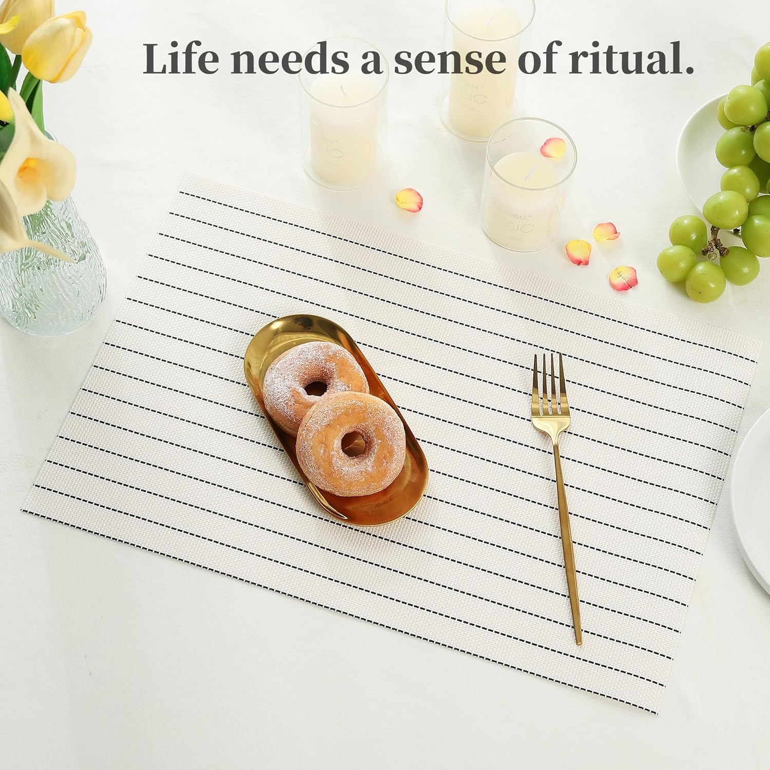 Leetaltree White with Black Stripes Placemats Set of 8 - Heat Resistant Non-Slip Place mats for Dining Table, Washable Durable PVC Vinyl Woven Table Mats(White Stripes, 8)
