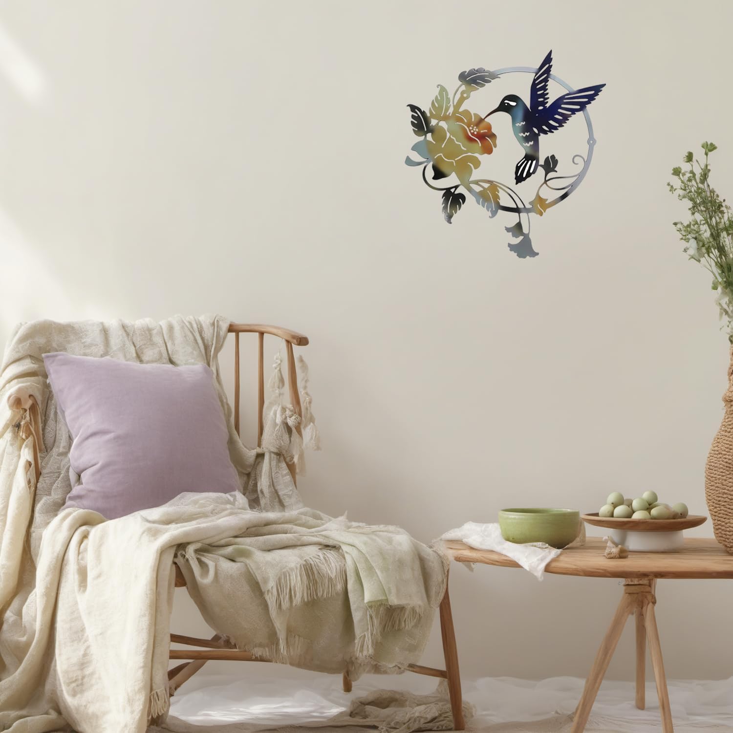 - The lovely metal hummingbird wall decorations have floral patterns. They give off a natural, harmonious, and friendly atmosphere. Put them in your home to decorate it. They will bring more joy to your life.