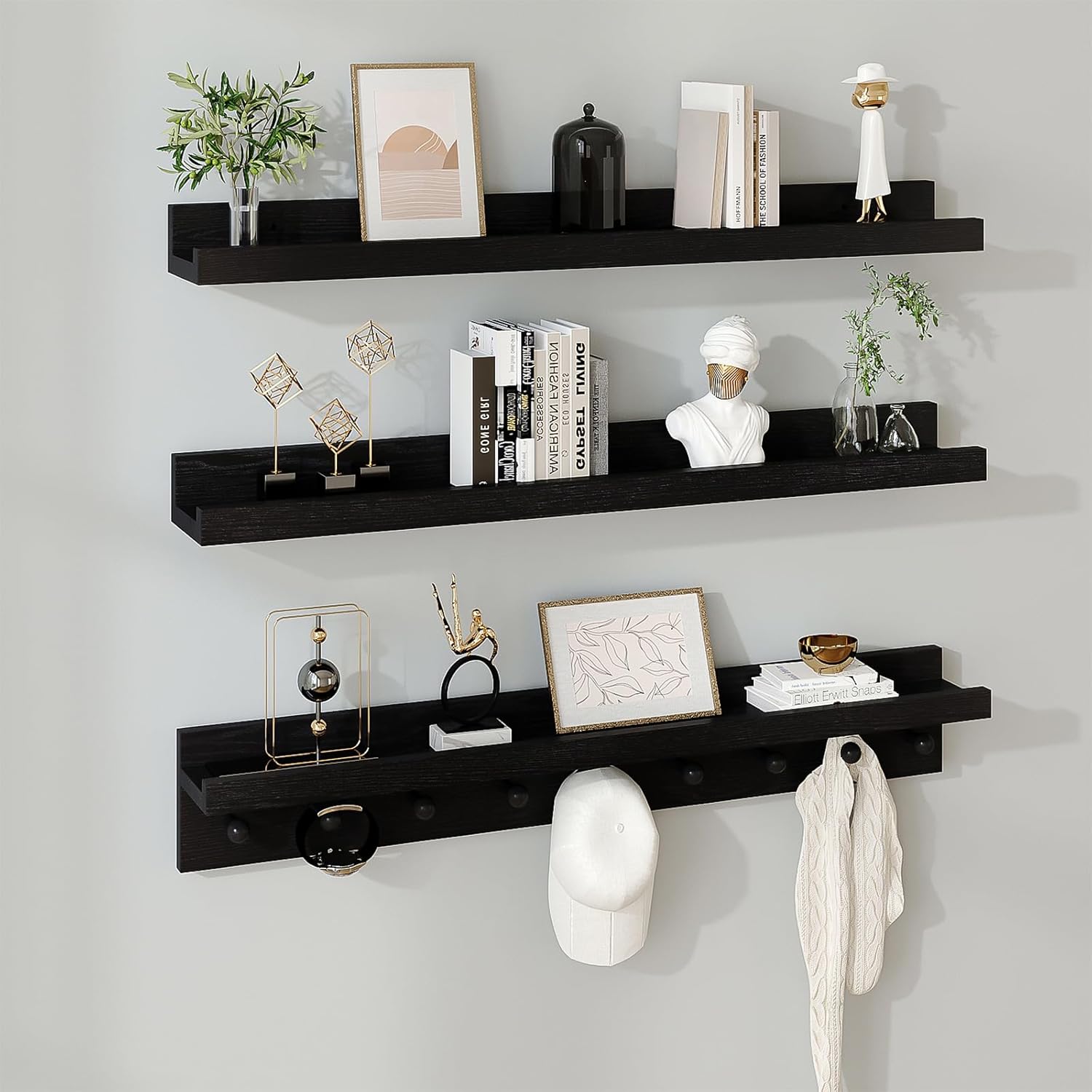 MBYD Black Picture Ledge Shelf with Hooks, 24 Inch Floating Book Shelves Kids Room, Wall Mounted Nursery Bookshelves, Hanging Bookshelf for Bedroom, Living Room, Kitchen, Bathroom Set of 3