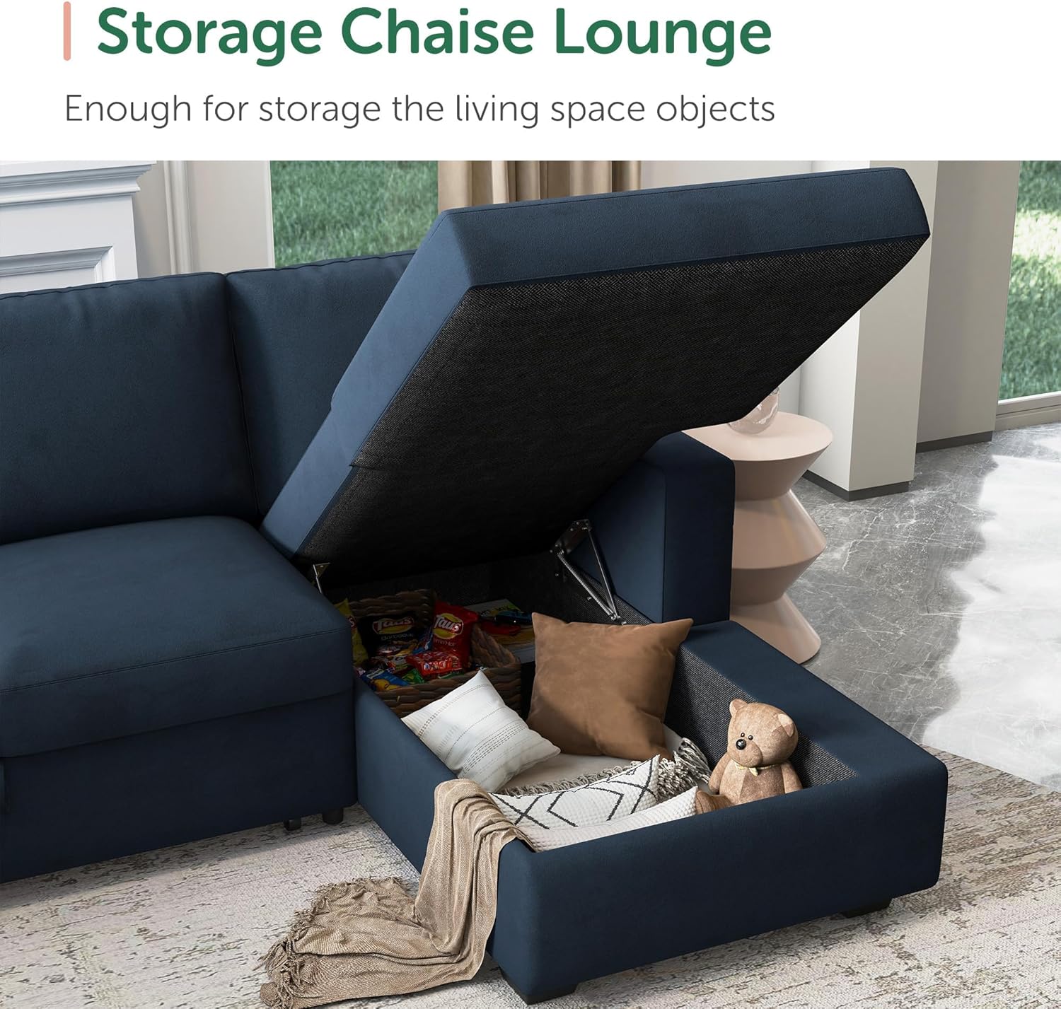 HONBAY Sectional Sleeper Sofa with Pull Out Bed U-Shape Sectional Couch Sleeper Bed with Storage Chaise Lounge Living Room 6 Seater Sectional Sofa Bed,Velvet Dark Blue