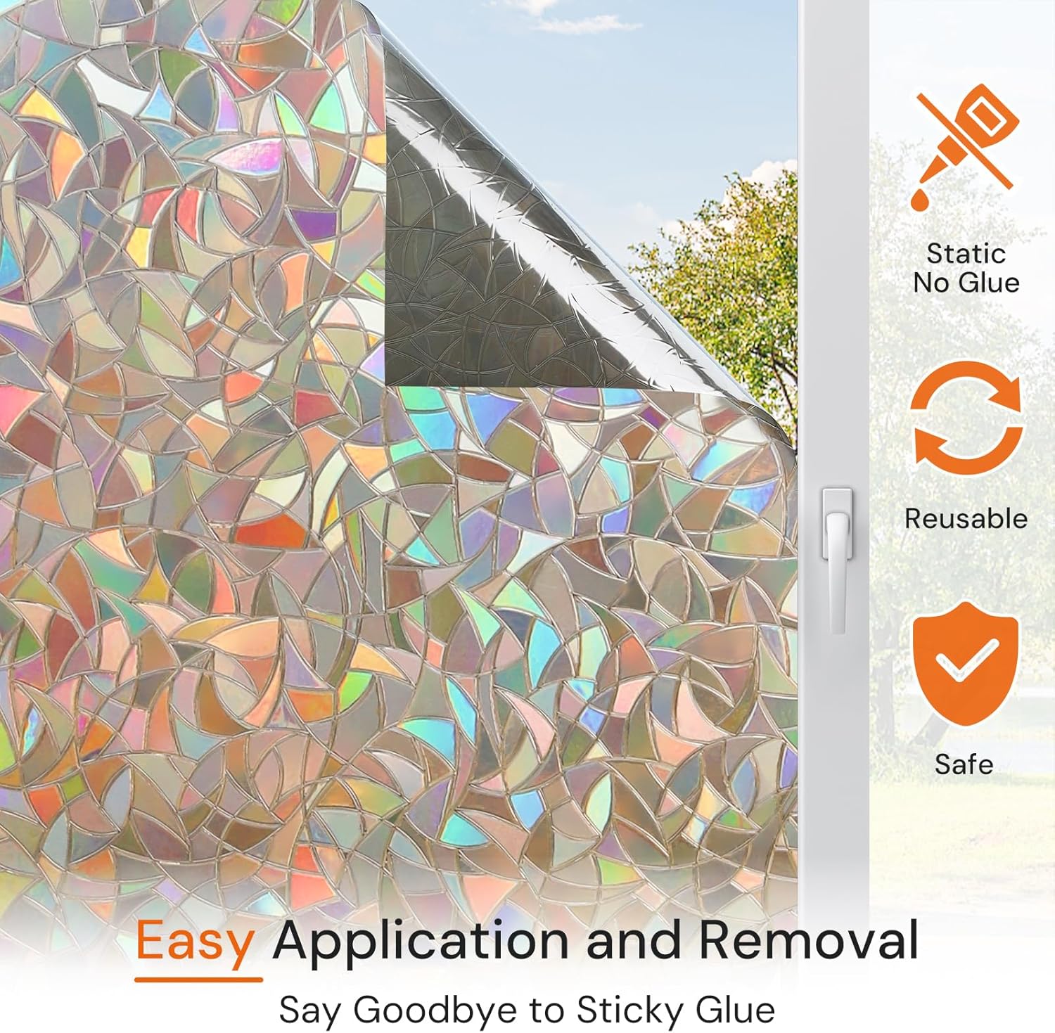 - Stunning Home Decoration: The window decals feature unique and irregular patterns that create a mesmerizing rainbow effect when sunlight or intense lighting passes through. Decorative window film add a touch of magic to your surroundings. Moreover, different rainbow effects, influenced by the sun's position and intensity, bring delightful surprises to your everyday life. Note: the window film roll looks like black until it is installed