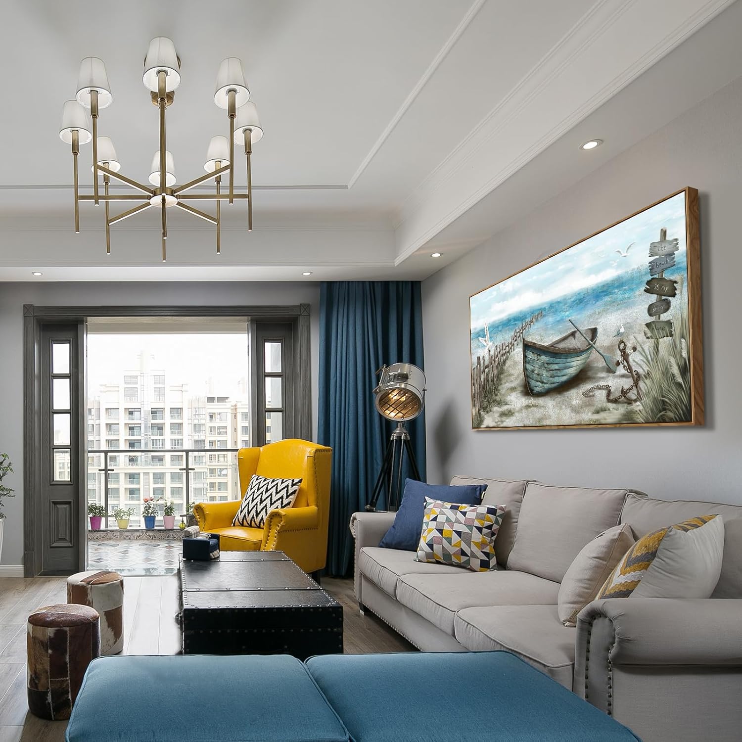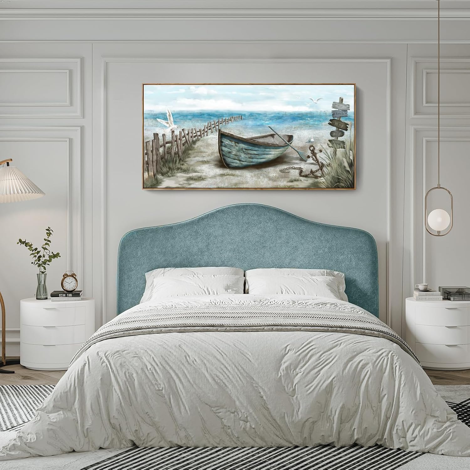 - Calming Seashore Aesthetic: This serene extra large coastal decor wall art captures sea bird resting on the rowboat. Behind the boat is blue ocean with the soaring seagulls. The nautical palette of blues, sand beige, tan, and fluffy white clouds provide a soothing feel. Hang this framed beach themed wall art up for a calming vibe, and escape to the beach each day after work in the comfort of your home.