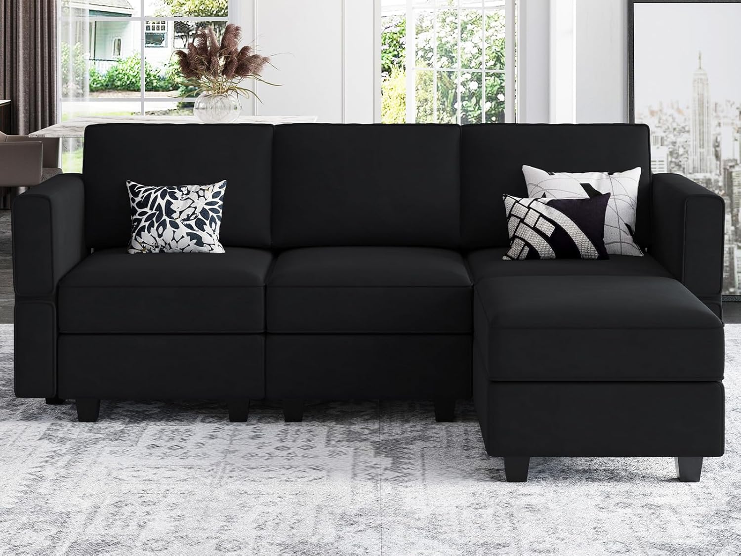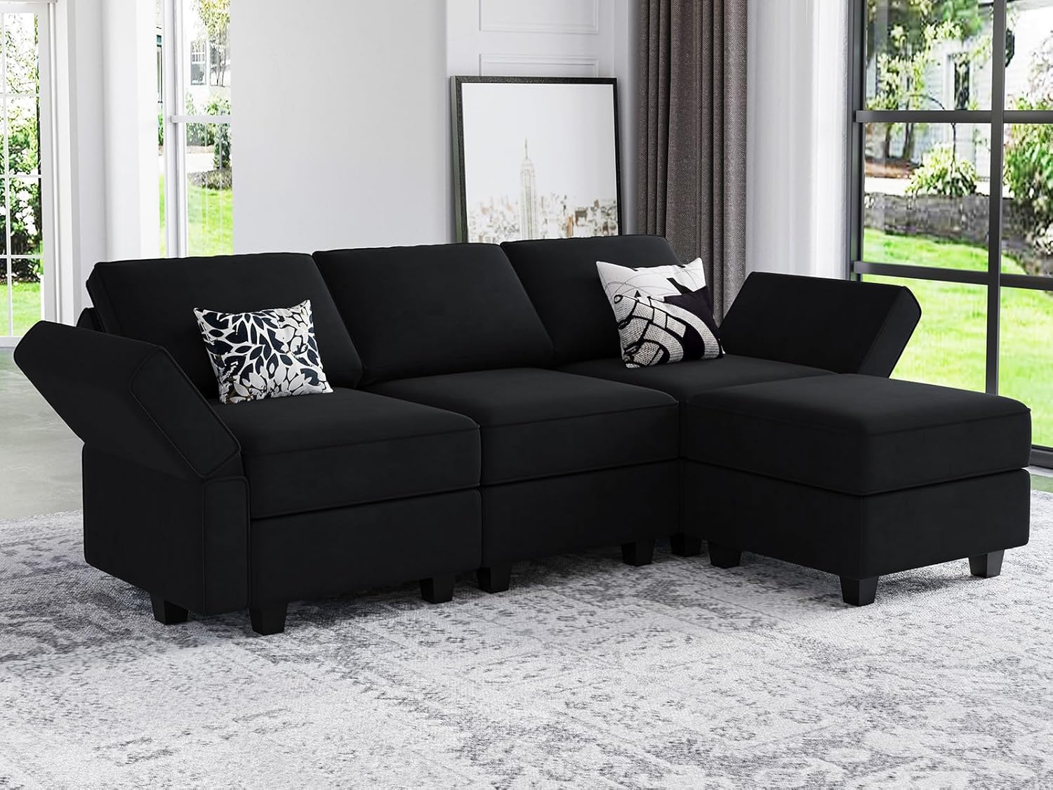 Belffin Modern L Shaped Velvet Sectional Sofa with Chaise, Black, Storage, Adjustable Arm/Backrest