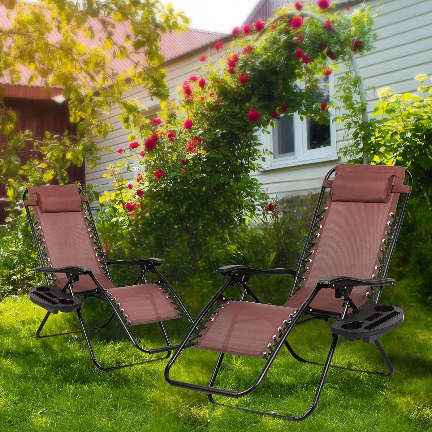 Nazhura Set of 2 Relaxing Recliners Patio Chairs Adjustable Steel Mesh Zero Gravity Lounge Chair Beach Chairs with Pillow and Cup Holder Khaki (Brown)
