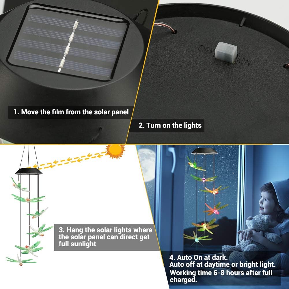 - 【Solar Powered Wind Chimes】 Featuring a unique design with 6 dragonfly shaped lights charge automatically in the daytime and light up at night, free your hands, new version solar panel absorbs energy quickly, the solar Christmas lights can last up to 8-10 hours after fully charged.(Christmas Lights, Christmas Decorations, Gift for Mom, Gifts for Grandma, Mom Gift, Grandma Gift, Birthday Gift for Mom, Birthday Gift for Grandma)