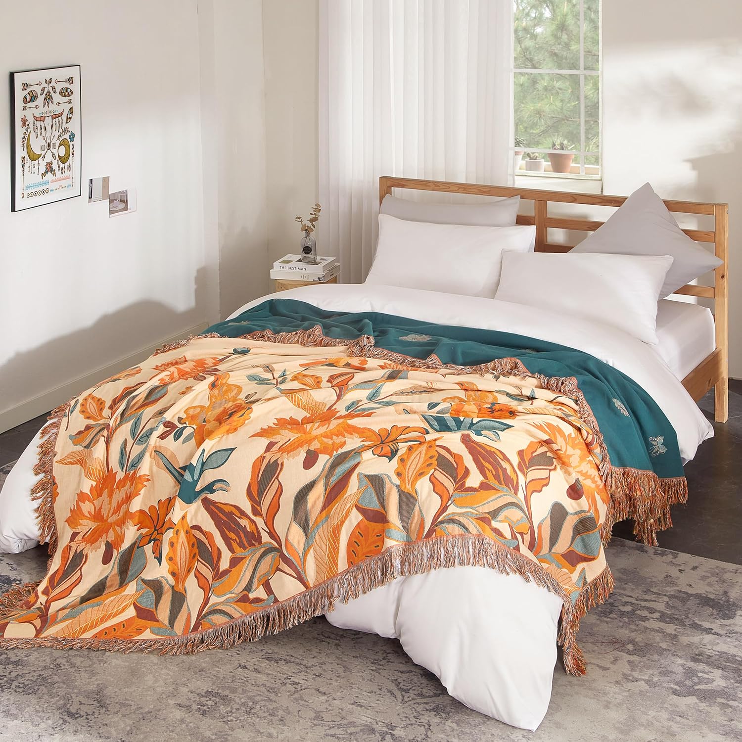Boho Throw Blanket for Bed 60”x80”, 100% Cotton Woven Blanket for Couch Sofa, Ultra Soft 4-Layer Muslin Quilt with Floral Printed, Farmhouse Bed Blanket/Cover for Living Room Decor
