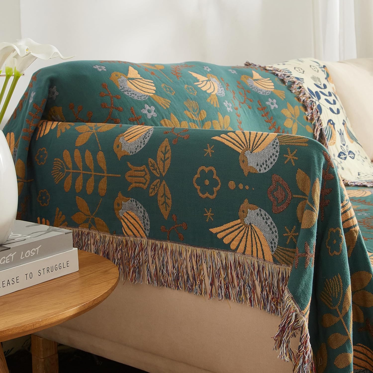 Boho Throw Blanket for Bed 80”x90”, 100% Cotton Woven Blanket for Couch Sofa, Ultra Soft 4-Layer Muslin Quilt with Bird Floral Printed, Farmhouse Bed Blanket/Cover for Living Room Decor