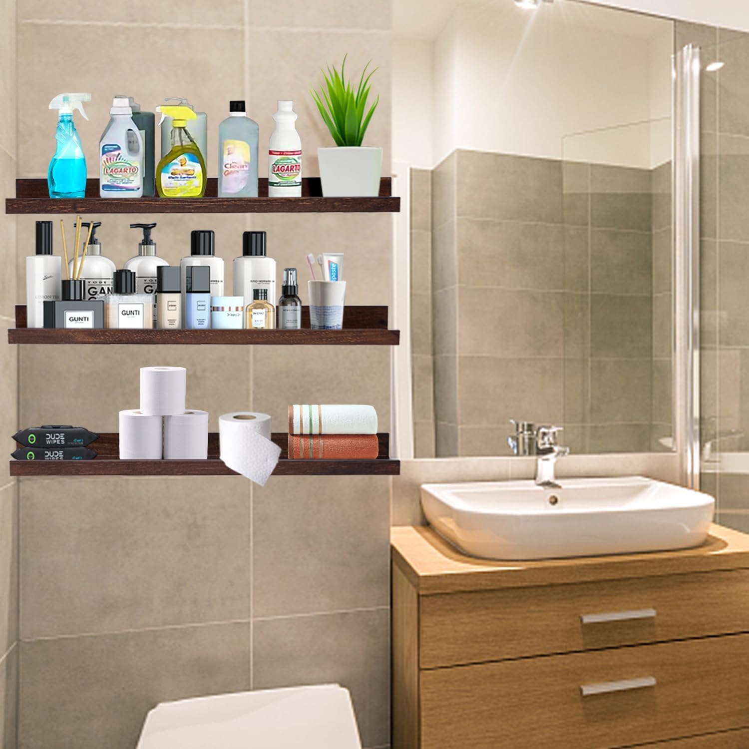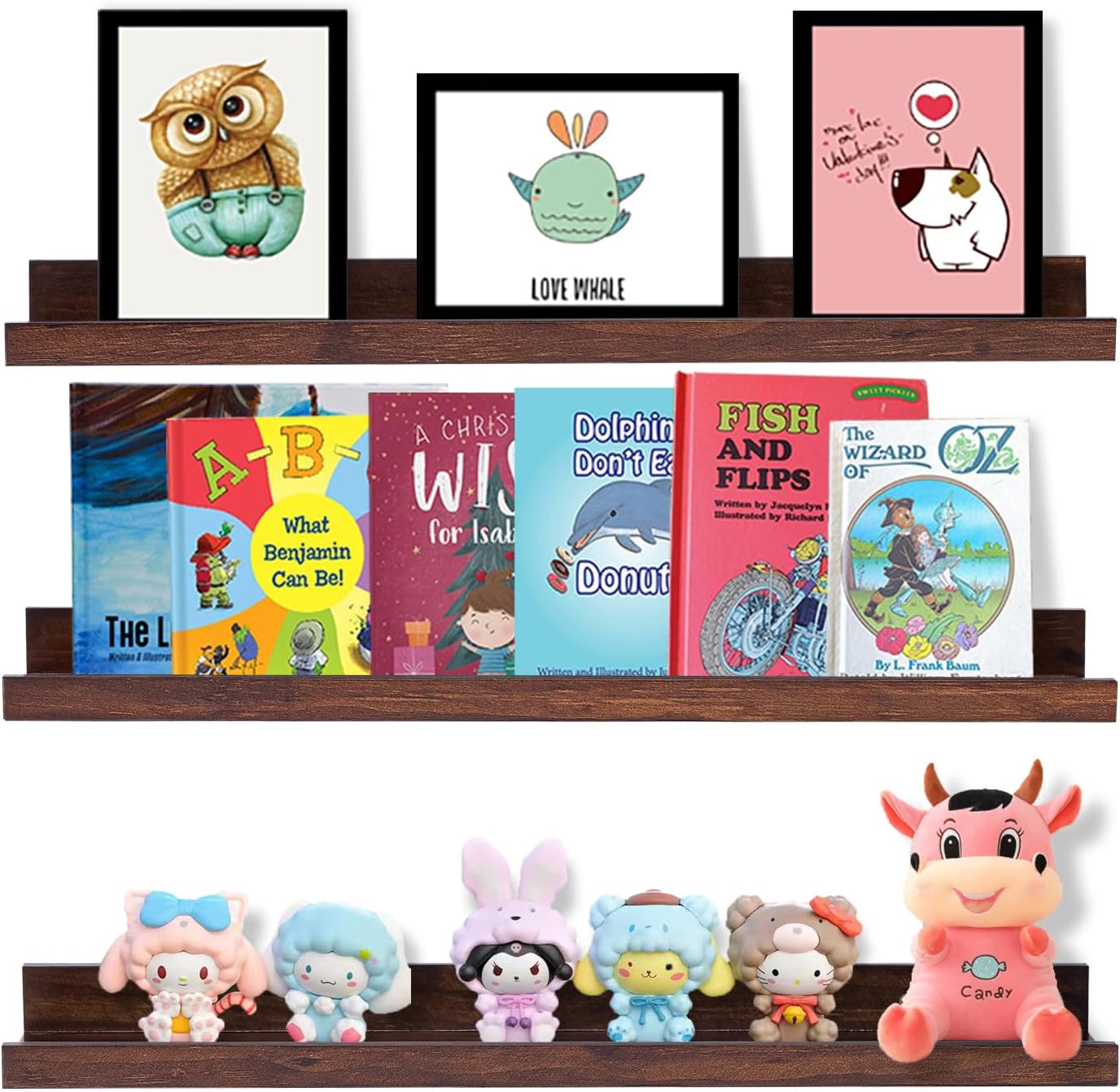 AZSKY Walnut Floating Shelves 24 Inch Picture Ledge Shelf for Wall Photo Shelves with Lip for Pictures Nursery Room Bookshelf Wood Wall Shelves Set of 3 for Bedroom Living Room Bathroom Kitchen