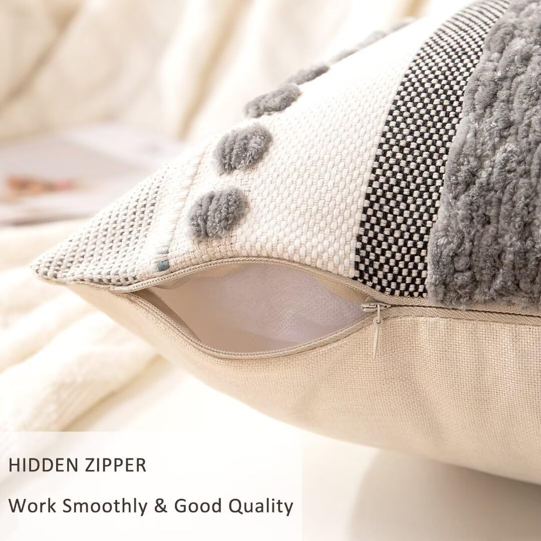 - Fabric: The gray and beige throw pillow case is made up of chenille and tufted on the front, and premium linen fabric on the back. Different styles on both sides offer you multiple decorative ideas. Sturdy stitching and careful hemming make the 18x18 boho pillow covers durable and exquisite. The zipper pulls up smoothly and is not easy to break