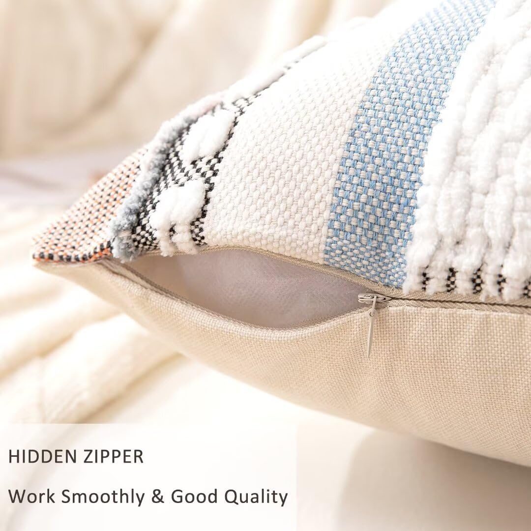 - Fabric: The stripe pillow case is made up of chenille and tufted on the front, and premium linen fabric on the back. Different styles on both sides offer you multiple decorative ideas. Sturdy stitching and careful hemming make the blue and orange pillow covers durable and exquisite. The zipper pulls up smoothly and is not easy to break